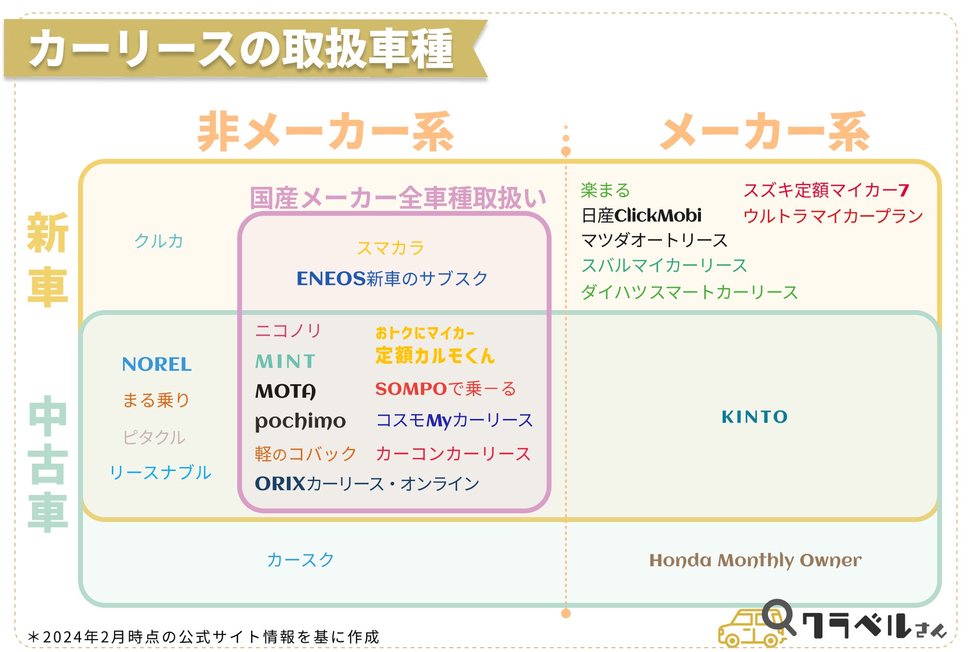 今回のカオスマップでは、自動車メーカーの提供か否かで各社を分類。さらに、車種の取扱状況でグループ分けを行いました。新車を取り扱う非メーカー系のカーリース・車のサブスクでは、国産メーカーの全車種を取り扱っているか、限定した車種のみかも見分けることができます。