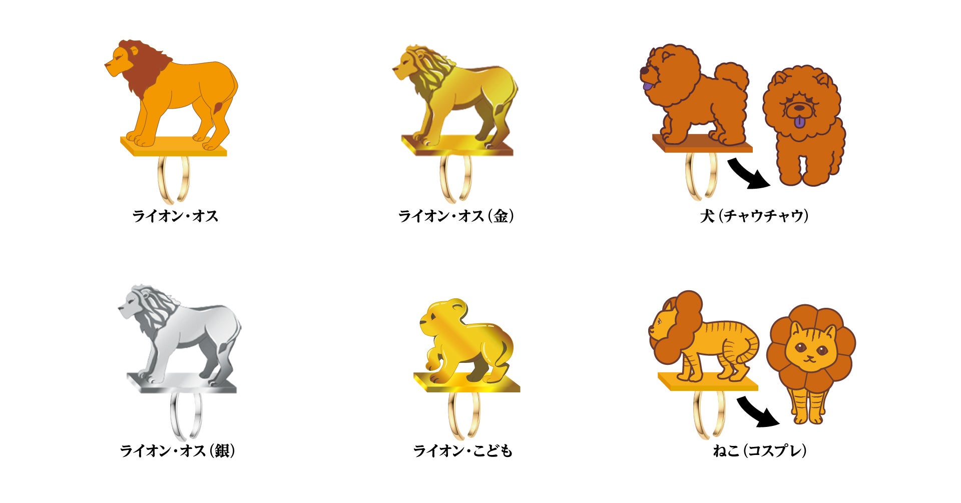 オスライオンはリアリティあるカラーをはじめ、金、銀と3種類、こどもライオンに続き、ライオンによせたようなフォルムの犬(チャウチャウ)にライオンのコスプレをしたかのような猫などユニークなラインナップも加えて、全6種類展開となっております。