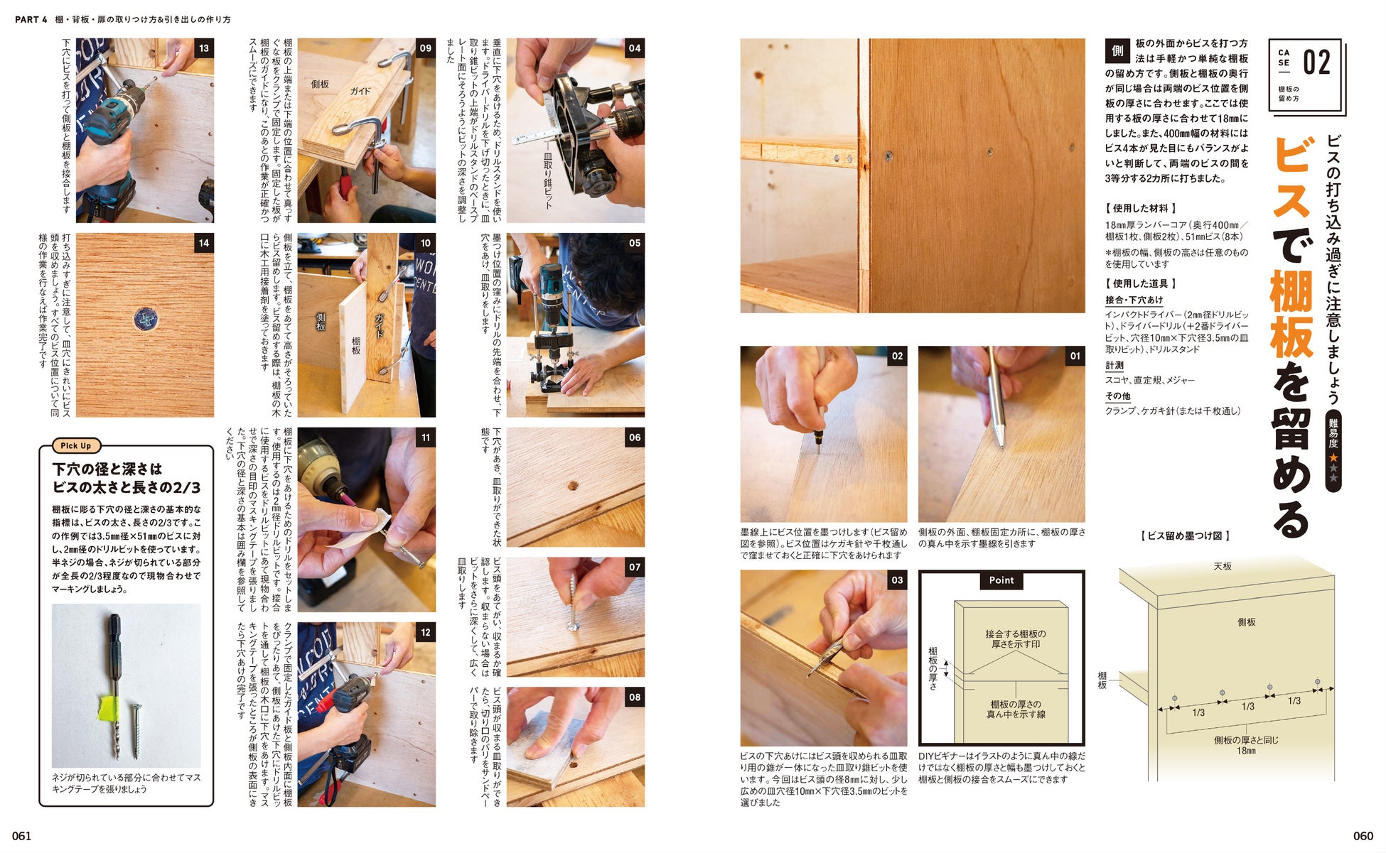 - 棚板や扉、背板のさまざまな取りつけ方を網羅