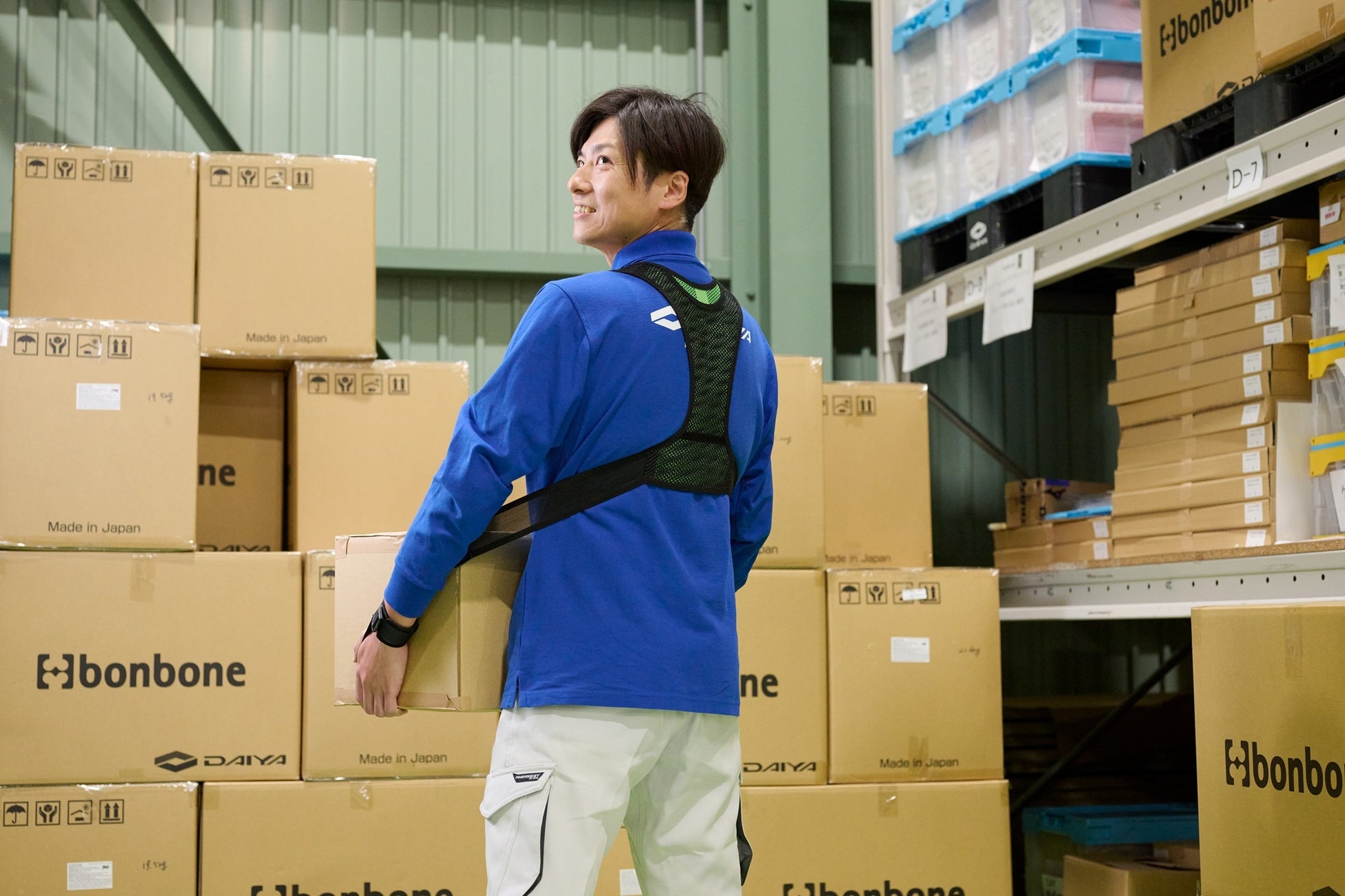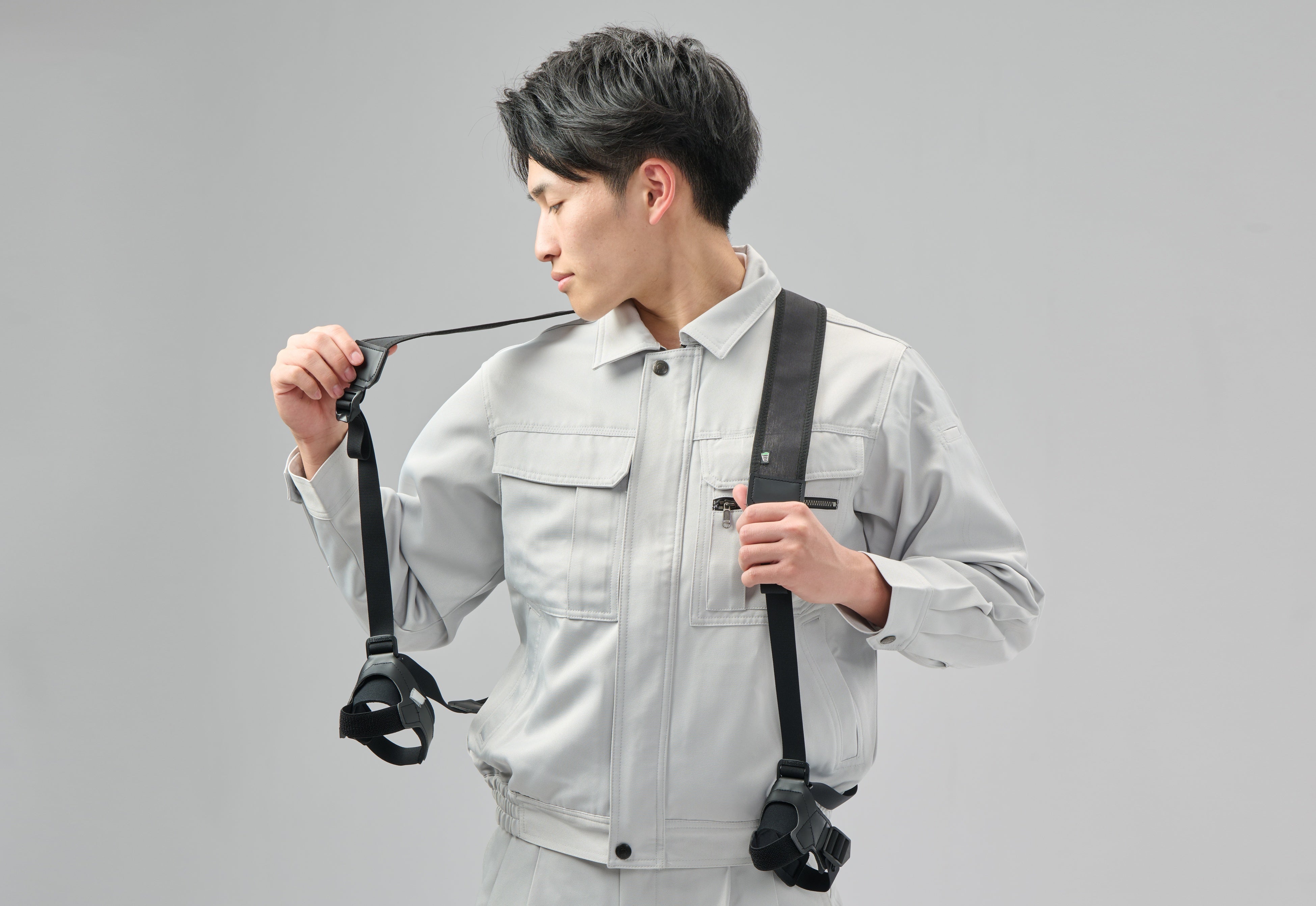 「装着に時間をかけたくない」という現場の声に応え、構造をゼロから見直しました。リュックのように背負って手首を通し、ベルトで調整するだけのシンプルな構造に変更。約10秒で素早く装着でき、作業の邪魔をしません。
