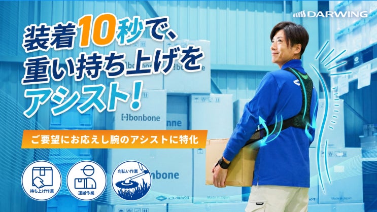 医療用品メーカーのダイヤ工業株式会社(本社:岡山県岡山市 代表取締役:松尾浩紀)は、清水建設株式会社(本社:東京都中央区 代表取締役社長:新村達也)と共同開発した掘削作業用アシストスーツを大幅にリニューアルし、新製品「DARWING Lift Up AS(ダーウィン リフト アップ エーエス)」として、2026年4月2日(木)よりアタラシイものや体験の応援購入サービス「Makuake」にて先行販売を開始いたしました。