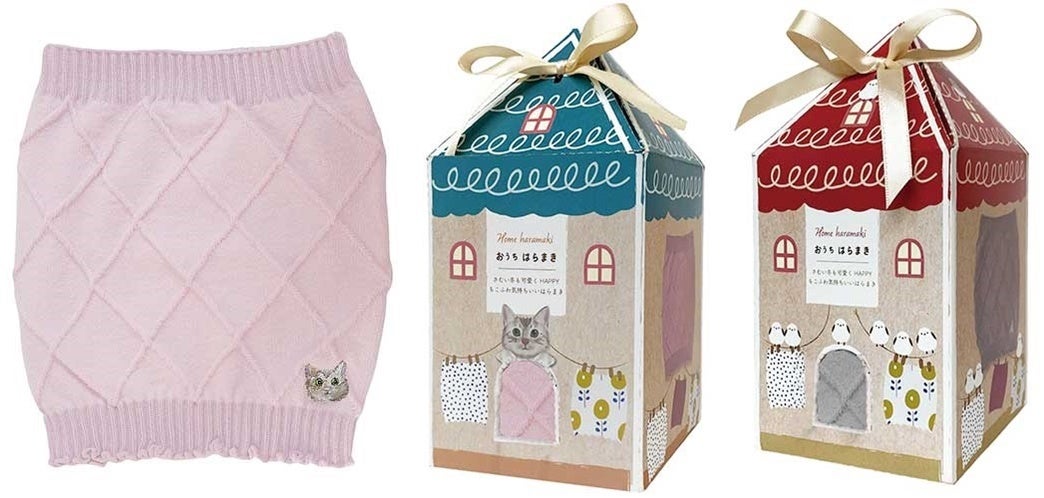 家の形のパッケージがかわいいギフトにおすすめの腹巻です。アクセントにねこかシマエナガの刺繡をお選びいただけます。