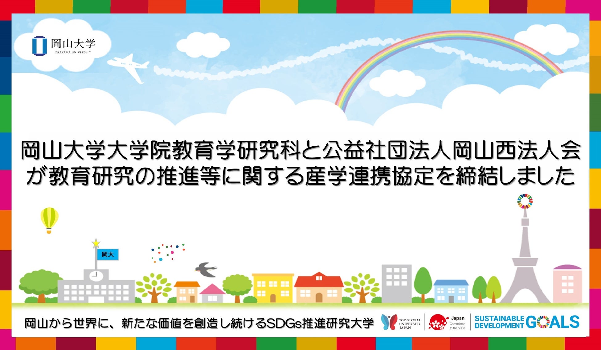 国立大学法人岡山大学(本部:岡山市北区、学長:槇野博史)の大学院教育学研究科は2022年1月28日、教育研究の一層の推進を図るとともに、未来を担う人材の育成を通じて地域社会の発展に寄与することを目的として、公益社団法人岡山西法人会と教育研究の推進等に関する産学連携協定を締結しました。