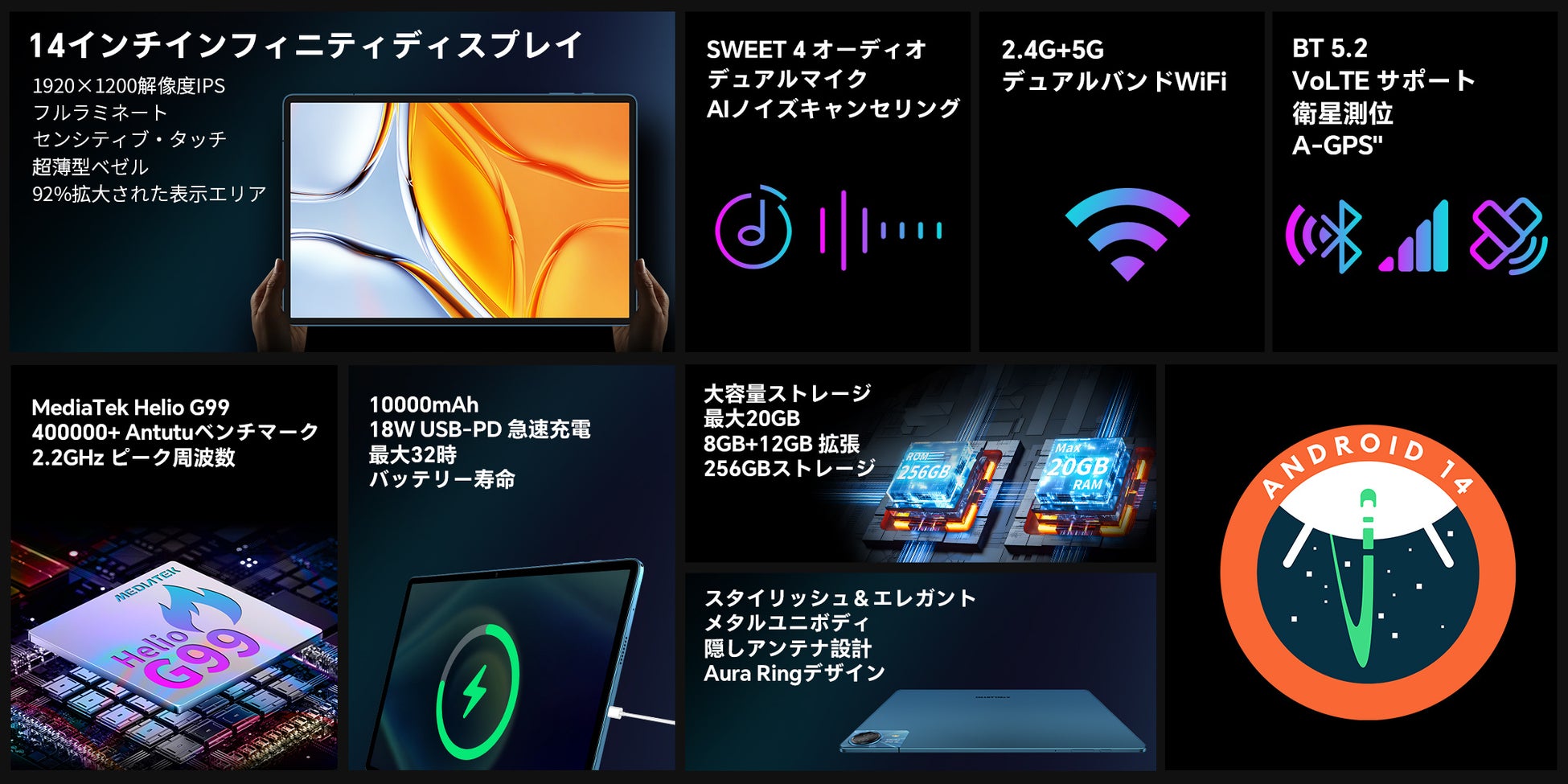 洗練されたユニボディデザインとAura Ring設計により、タブレットの外観はスタイリッシュかつ機能的。10000mAhの大容量コバルトリチウムバッテリーが長時間使用を可能にし、USB-PD対応の急速充電で素早く再稼働できます。薄型で軽量な本体は、持ち運びやすさと高級感を両立しています。