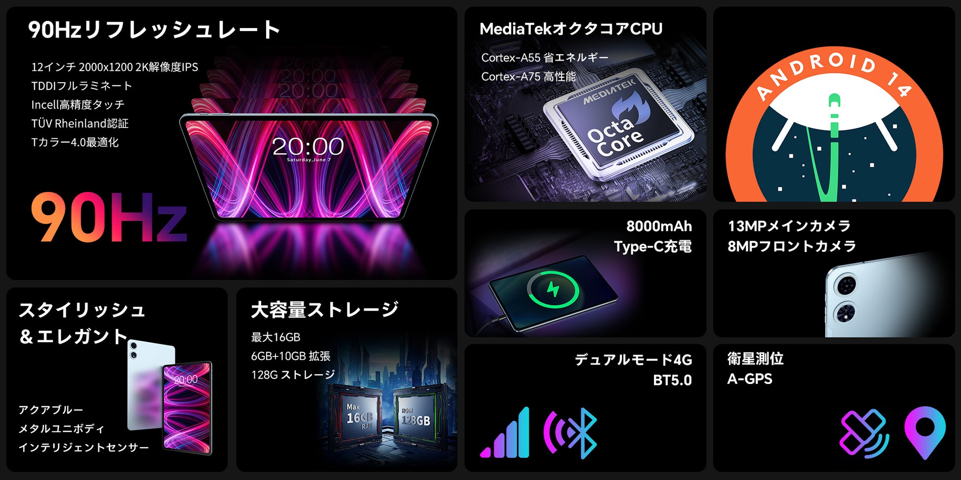 TDD+FDDデュアルモード4G LTEやデュアルバンドac Wi-Fiをサポートし、スムーズで高速なネット接続を提供。Bluetooth 5.2によるロスレスオーディオ体験や、LDAC、AAC、SBCコーデックにも対応しています。8MPフロントカメラは顔認証によるスムーズなロック解除機能を備え、13MPリアカメラはAI画像処理とオートフォーカス機能で高品質な写真撮影を可能にします。さらに、4つの主要衛星測位システム(北斗、GPS、GLONASS、GALILEO)に対応し、正確なナビゲーションをサポートします。Teclast T70は、仕事、エンターテインメント、日常利用をシームレスに支える理想的なタブレットです。
