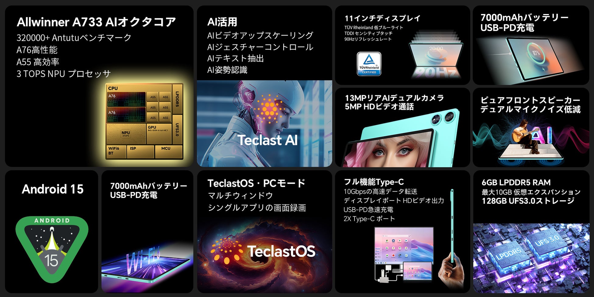 11インチのTÜV Rheinland認定IPSディスプレイは、目に優しい低ブルーライト技術を採用し、長時間の使用でも快適です。90Hzの可変リフレッシュレートとAI搭載T-Colour 6.0が、スムーズな映像と鮮やかな色彩を提供します。13MPのAIデュアルカメラと5MPフロントカメラが、鮮明な写真やビデオ撮影を可能にし、カメラ共有機能を利用すればPCやオンライン会議での活用も簡単です。PCモードを利用してタブレットをPCライクに操作でき、複数のウィンドウ操作やマルチタスク機能で効率的な作業をサポートします。Teclast P50AIは、AIとAndroid 15の力を活かし、エンターテインメント、仕事、学習のあらゆる場面に対応する理想的なタブレットです。