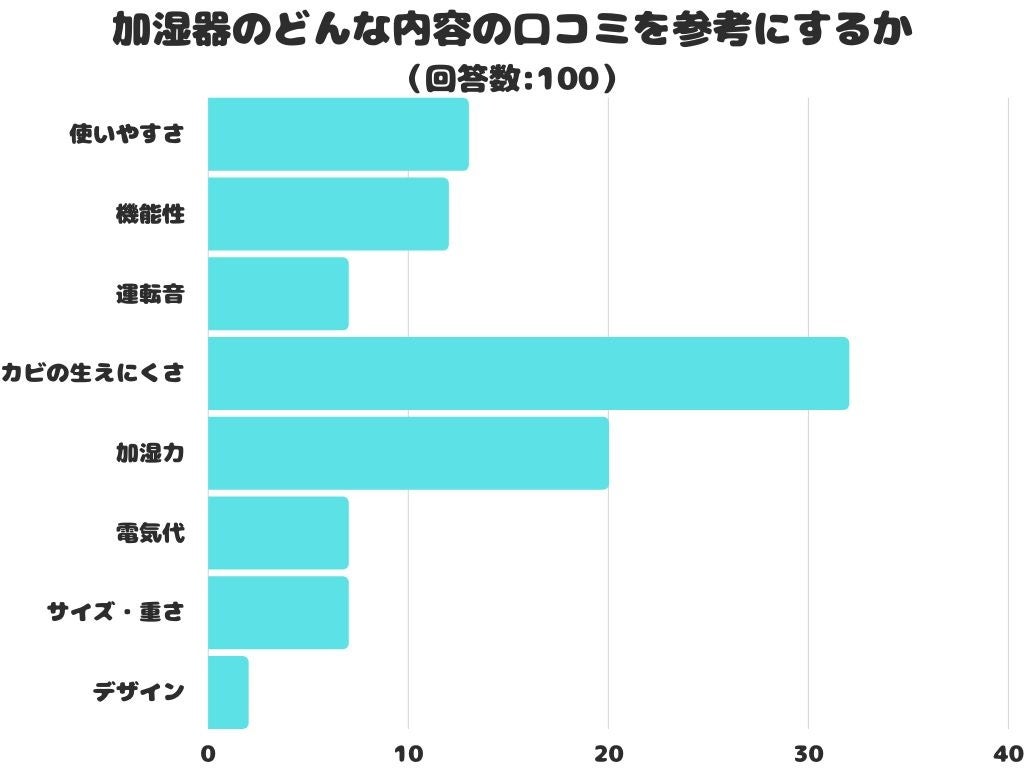 加湿器のどんな内容の口コミを参考にするかをアンケートにて調査したところ、1位は「カビの生えにくさ」でした。