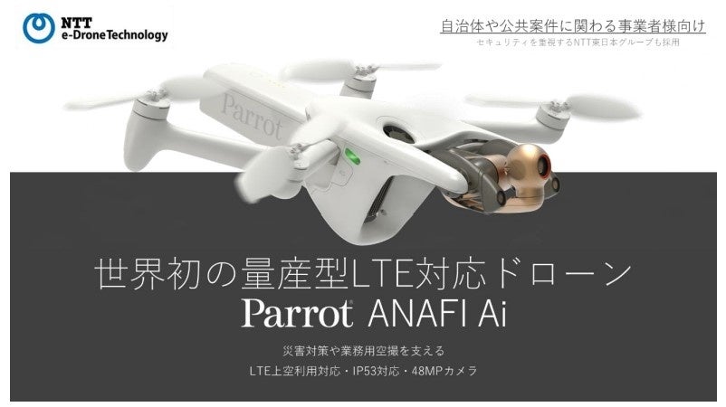 このようなニーズをふまえ、「機能」「セキュリティ」「サポート」の観点から、自治体や公共事業に関わる法人向けに最適な機種を検討した結果、セキュリティ対策を確保したうえで、空撮時に地上の様子を高精細に撮影可能なカメラ性能に優れ、LTE上空利用への対応や防水防塵性能IP53に対応した欧州最大手のドローンメーカーであるParrot社製のANAFI Aiの提供を開始します。