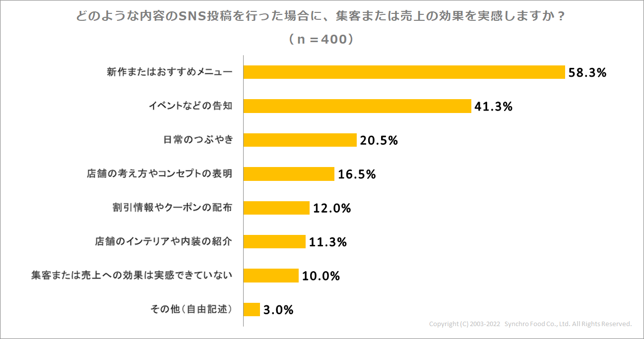 続いて、どのような内容の投稿が集客や売上に効果があるように感じるか聞いてみると、「新作またはおすすめメニュー」が最も多い58.3%で、次に「イベントなどの告知」が41.3%という結果に。上位3つのSNS別でも同様の順位となりました。