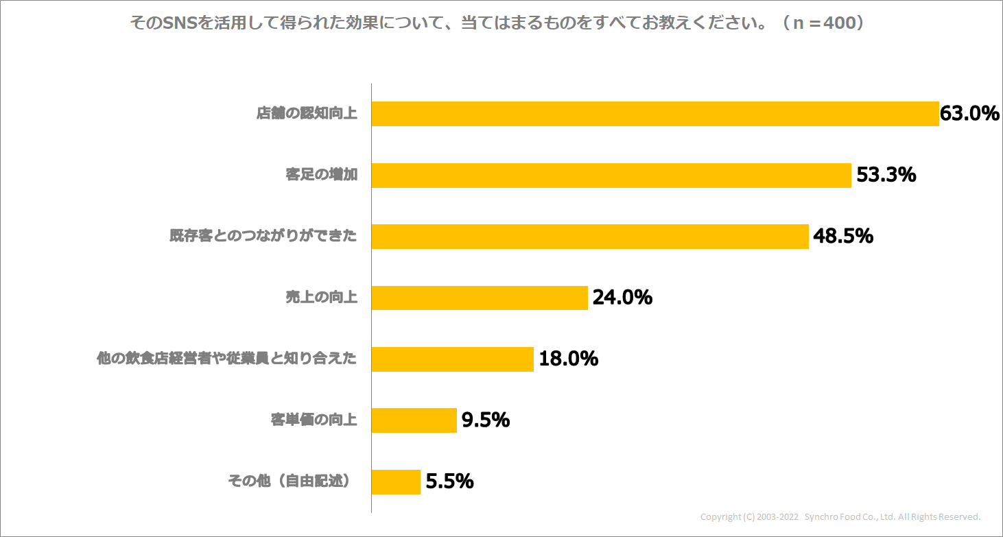 続いて、最も活用しているSNSからどのような効果が得られたかを尋ねると、「店舗の認知向上」が最も多い63%で、次に「客足の増加」が53.3%となりました。