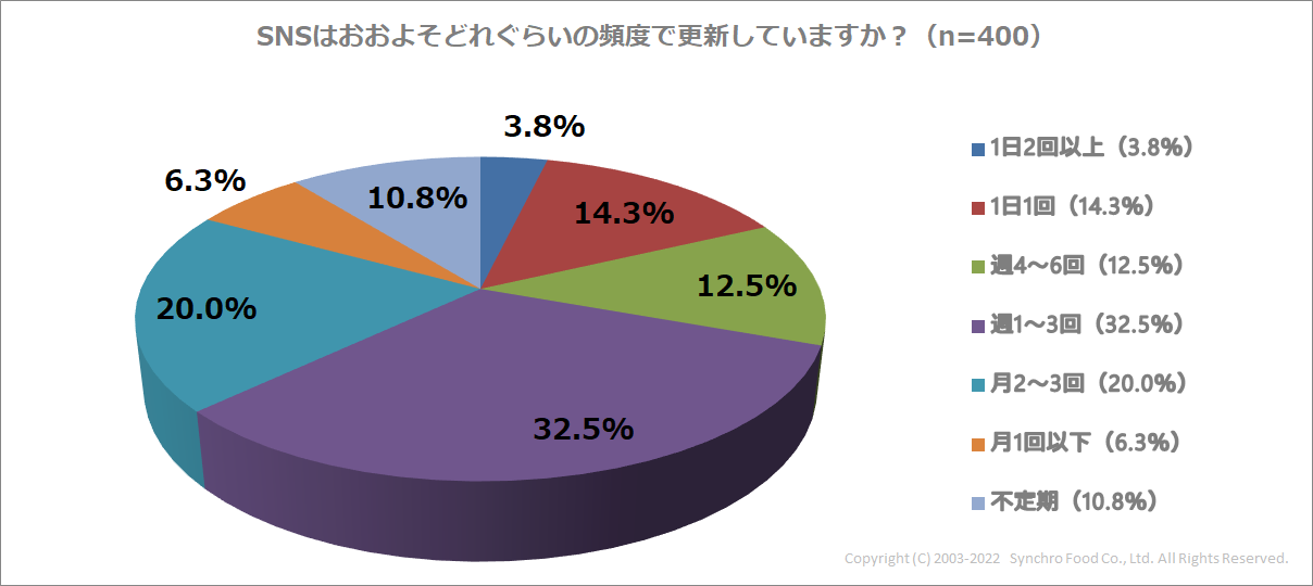 次に、SNSの更新頻度を尋ねたところ、最も多かったのは「週1〜3回」で32.5%でした。さらに「月に2〜3回(20%)」、「1日1回(14.3%)」、「週4~6回(12.5%)」と続く結果になりました。