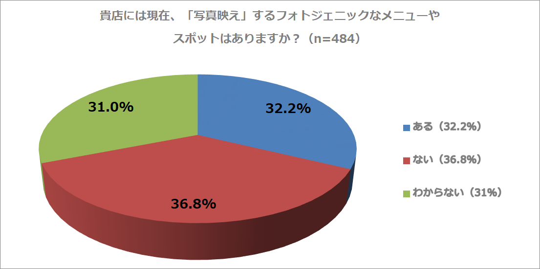 次に、店舗内に「写真映え」するフォトジェニックなメニューやスポットがあるか尋ねると、「ない(36.8%)」、「ある(32.2%)」、「わからない(31%)」と、回答が割れました。