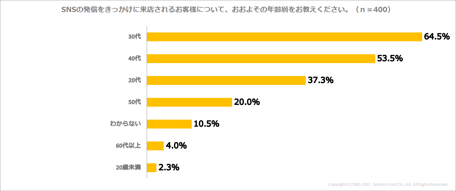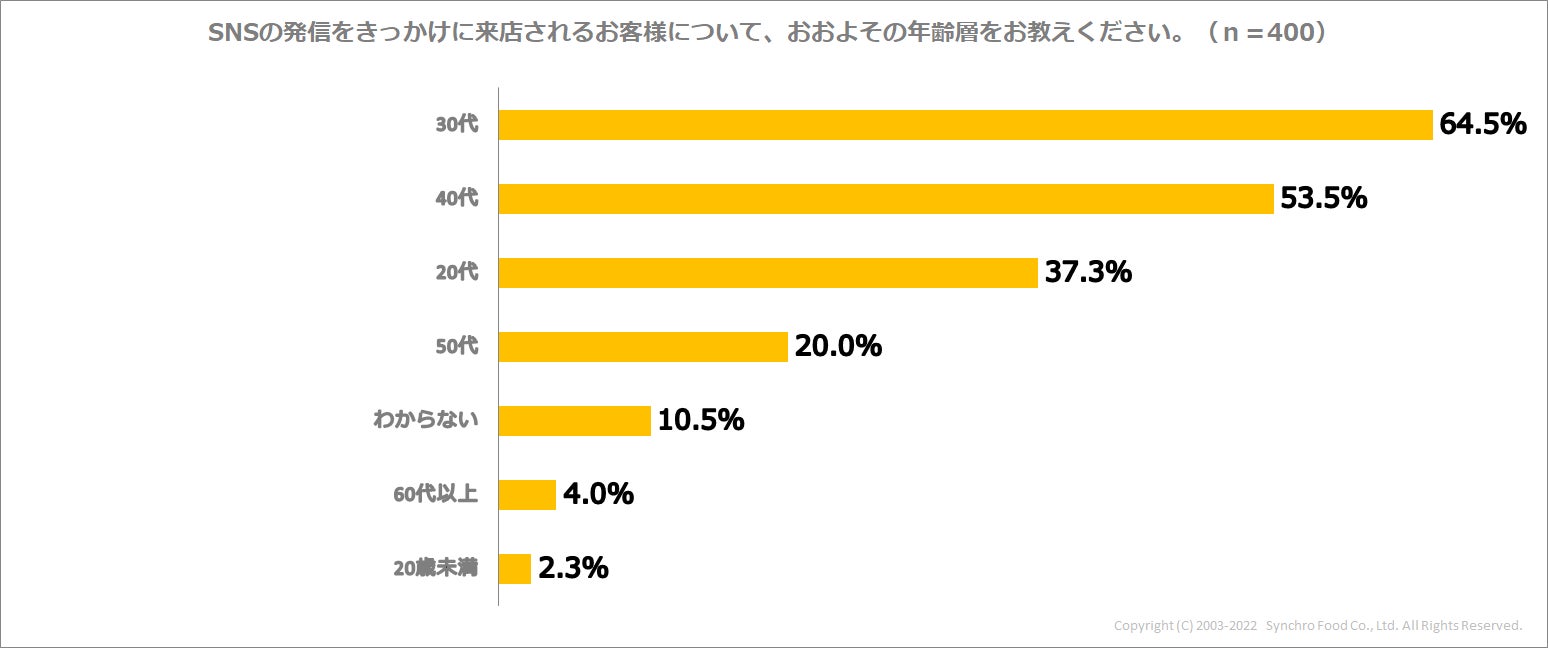 SNSの発信をきっかけに来店されるお客の、おおよその年齢層を聞くと「30代」が最も多い64.5%で、「40代」が53.5%、「20代」が37.3%と続きました。