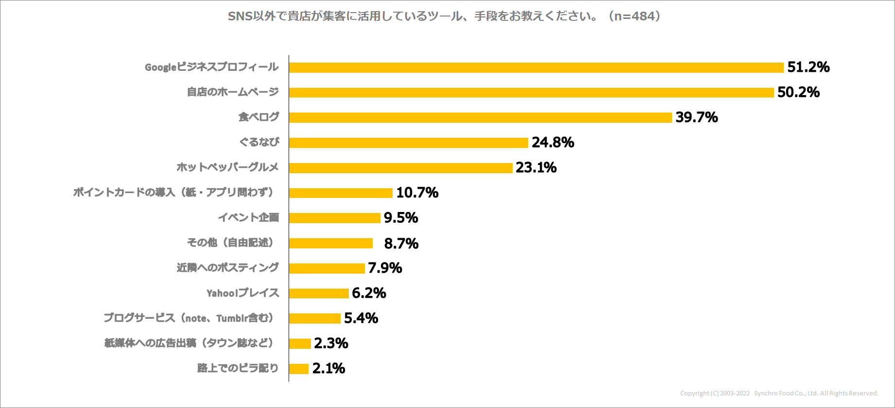 一方、SNS以外で集客に活用しているツールを尋ねると、「Googleビジネスプロフィール」が最も多い51.2%で、「自社のホームページ」が50.2%。次いで「食べログ(39.7%)」、「ぐるなび(24.8%)」、「ホットペッパーグルメ(23.1%)」と続きました。やはりSNSを除くと、インターネットサービスの活用が一般的であることがわかります。