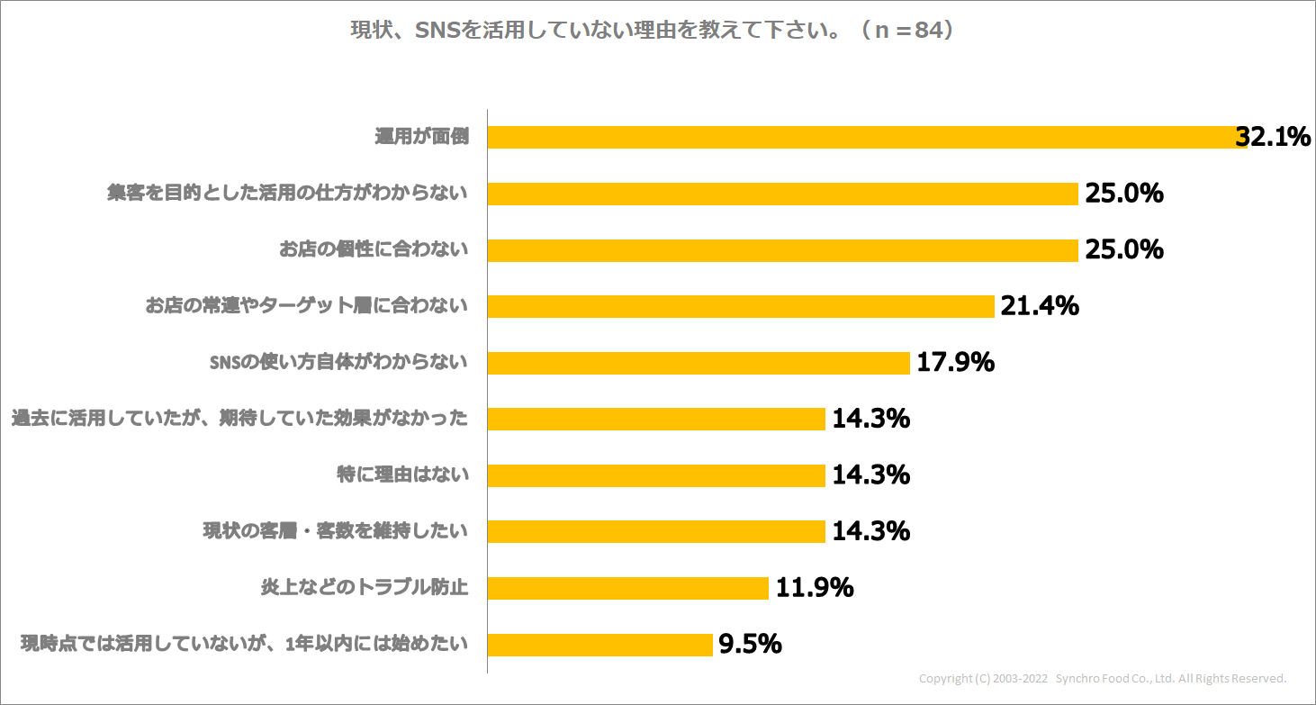 一方で、「いいえ」と答えた店舗にその理由を尋ねると、「運用が面倒」が最も多い32.1%で、「集客を目的とした活用の仕方がわからない」、「お店の個性に合わない」(ともに25%)と続きました。