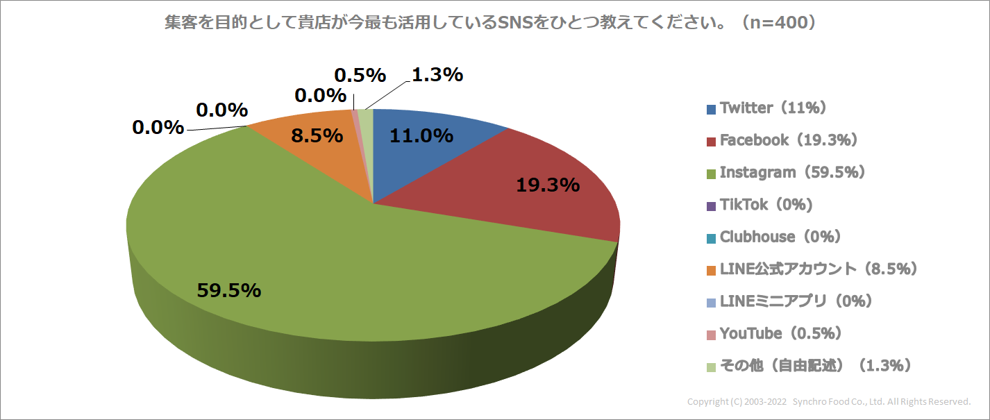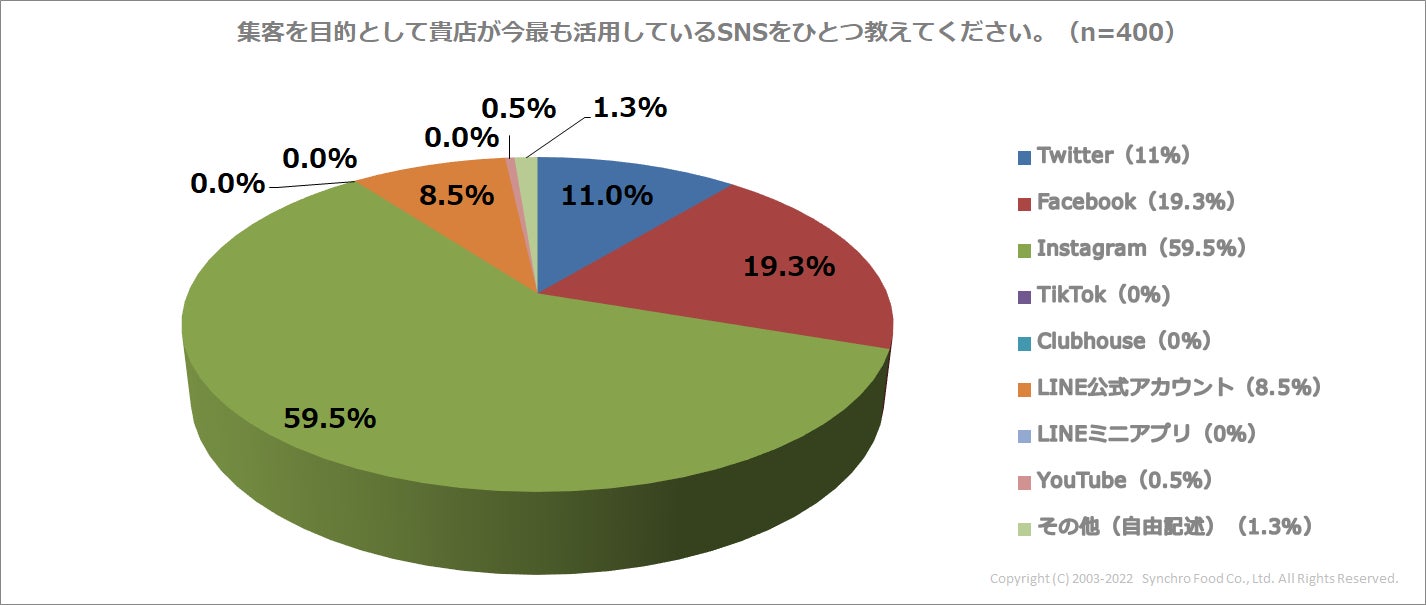 次に、「SNSを活用した集客を行っている」と答えた店舗に、最も活用しているSNSを聞いたところ、「Instagram」が最多の59.5%で、「Facebook(19.3%)」、「Twitter(11%)」と続きました。また、動画系SNSの「YouTube」は0.5%、「TikTok」は0%という結果になりました。