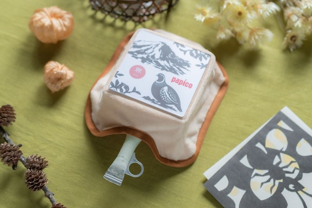 「ミニパピこたつ」とは、手を濡らさずに、パピコを食べごろななめらかさに解凍することができる、パピコ専用熱伝導カバーです。今回使用するのは「界」3施設のご当地の特徴をそれぞれ反映したオリジナルご当地デザインのもので、ご当地の文化に触れながら、パピコを解凍するまでの時間を楽しむことができます。「界 鬼怒川」では黒羽藍染や鹿沼(かぬま)組子(くみこ)の柄としても親しまれている麻の葉模様をモチーフにしており、「界 アルプス」では、長野県鳥である雷鳥やアルプスの山々をデザインしています。また、「界 雲仙」の「ミニパピこたつ」は長崎の和華(わか)蘭(らん)文化の1つ であるステンドグラスをモチーフにデザインしています。それぞれ館内や、大浴場内にも同様のデザインが施されており、湯上がりの気分を高めてくれます。