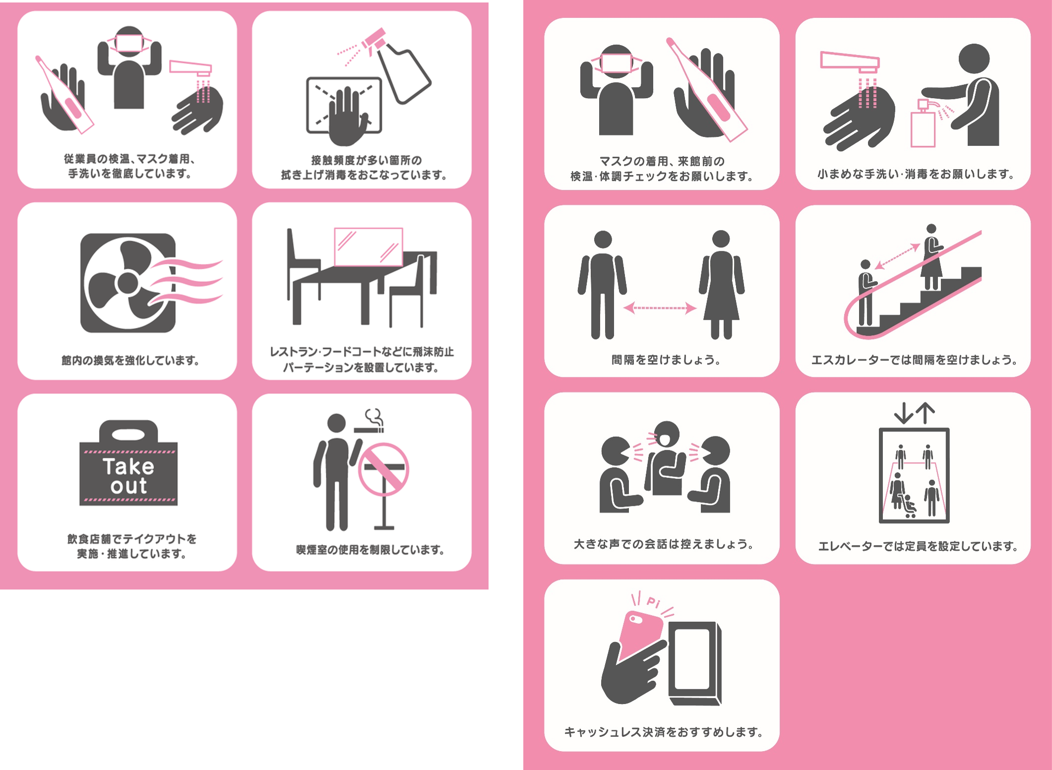 三井不動産グループが運営する商業施設では、新型コロナウイルス感染拡大防止のため、下記をはじめとした様々な取り組みを実施しております。
