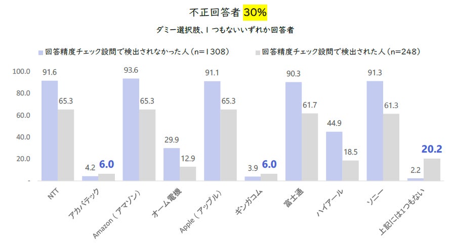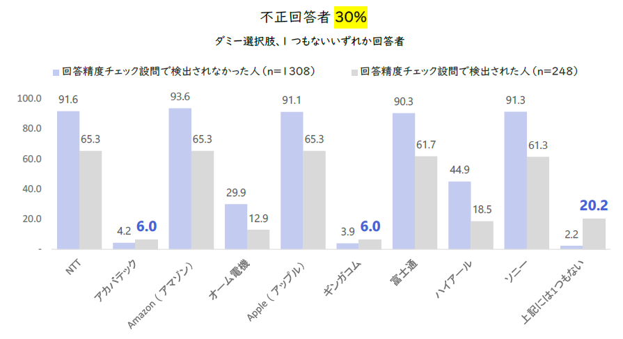 回答精度チェック設問で検出された回答者の内、架空企業の認知者が30%