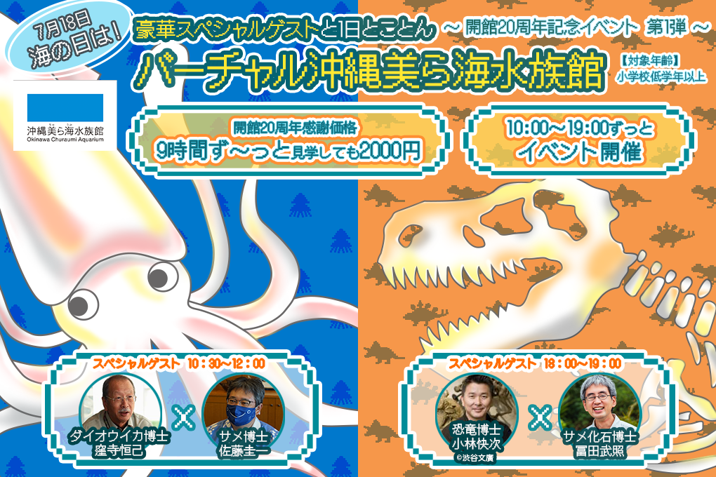 子供の頃の夢は恐竜博士!沖縄美ら海水族館でサメを研究する冨田武照博士が、世界的に有名な恐竜博士である小林快次先生をお招きして夢の対談を行います。恐竜学の最新ニュースも聞けちゃうかも?恐竜時代のサメの話も乞うご期待です。
