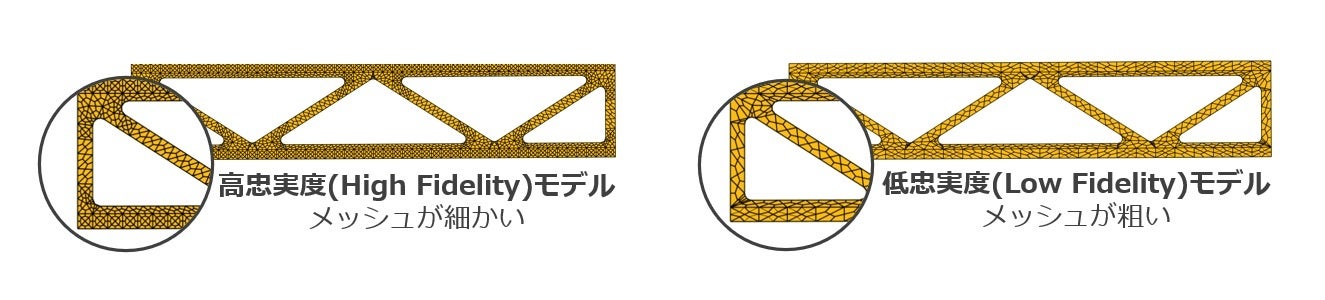 最適化の実施には、解析を何度も実行する必要があります。その際に利用する解析モデルがメッシュの細かい3Dの高忠実度(High Fidelity)モデルの場合、多くの時間がかかり計算コストが高くなります。