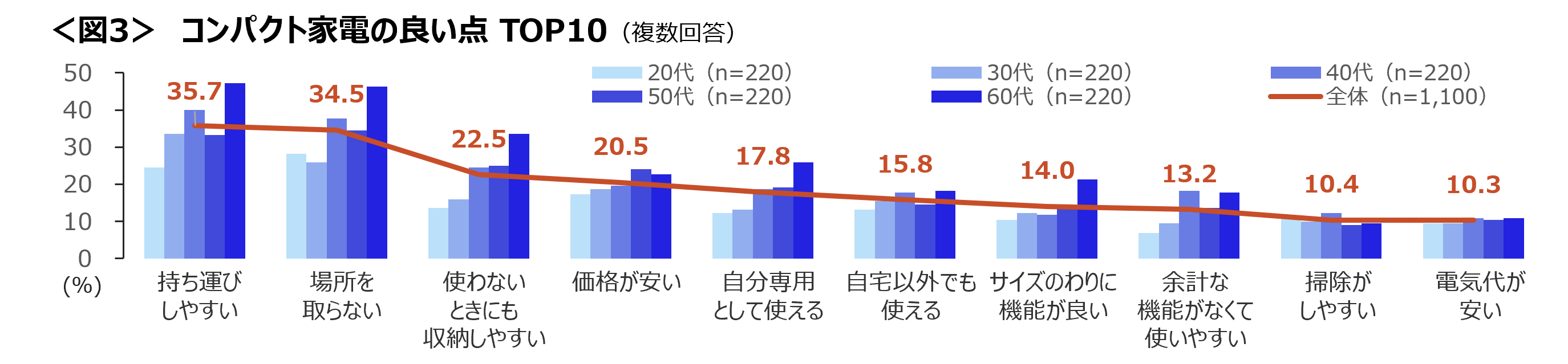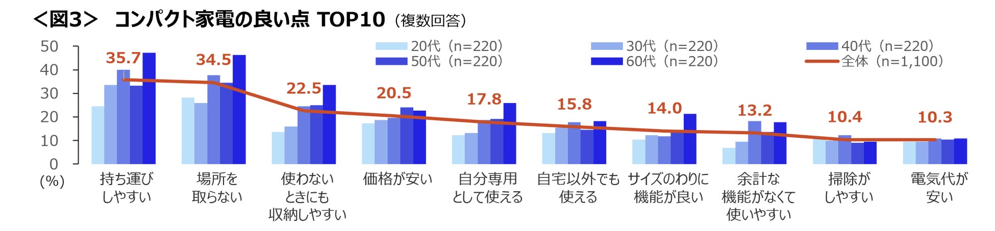 一方、20代は他の年代と比べ、全体的に割合が低く、コンパクト家電にメリットをあまり感じていない様子。<図3>