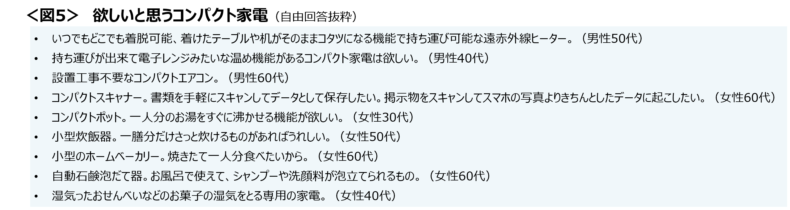 「自動石鹸泡だて器」「お煎餅などの湿気を取る専用家電」など特定のニーズに対する回答もみられた。<図5>