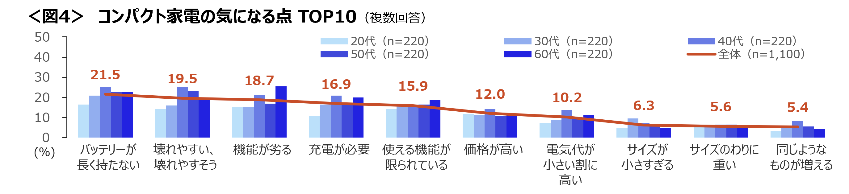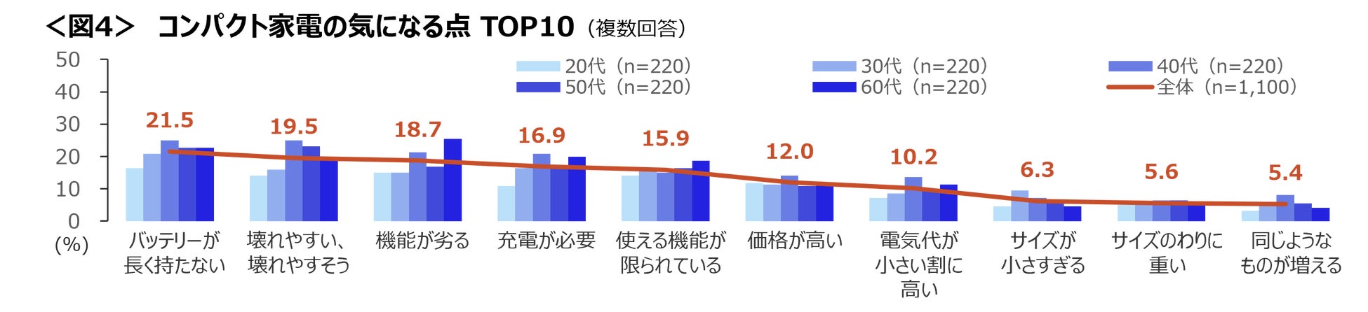 コンパクト家電の気になる点は、「バッテリーが長く持たない」「壊れやすい、壊れやすそう」「機能が劣る」などがあがるが、いずれも2割前後にとどまる。