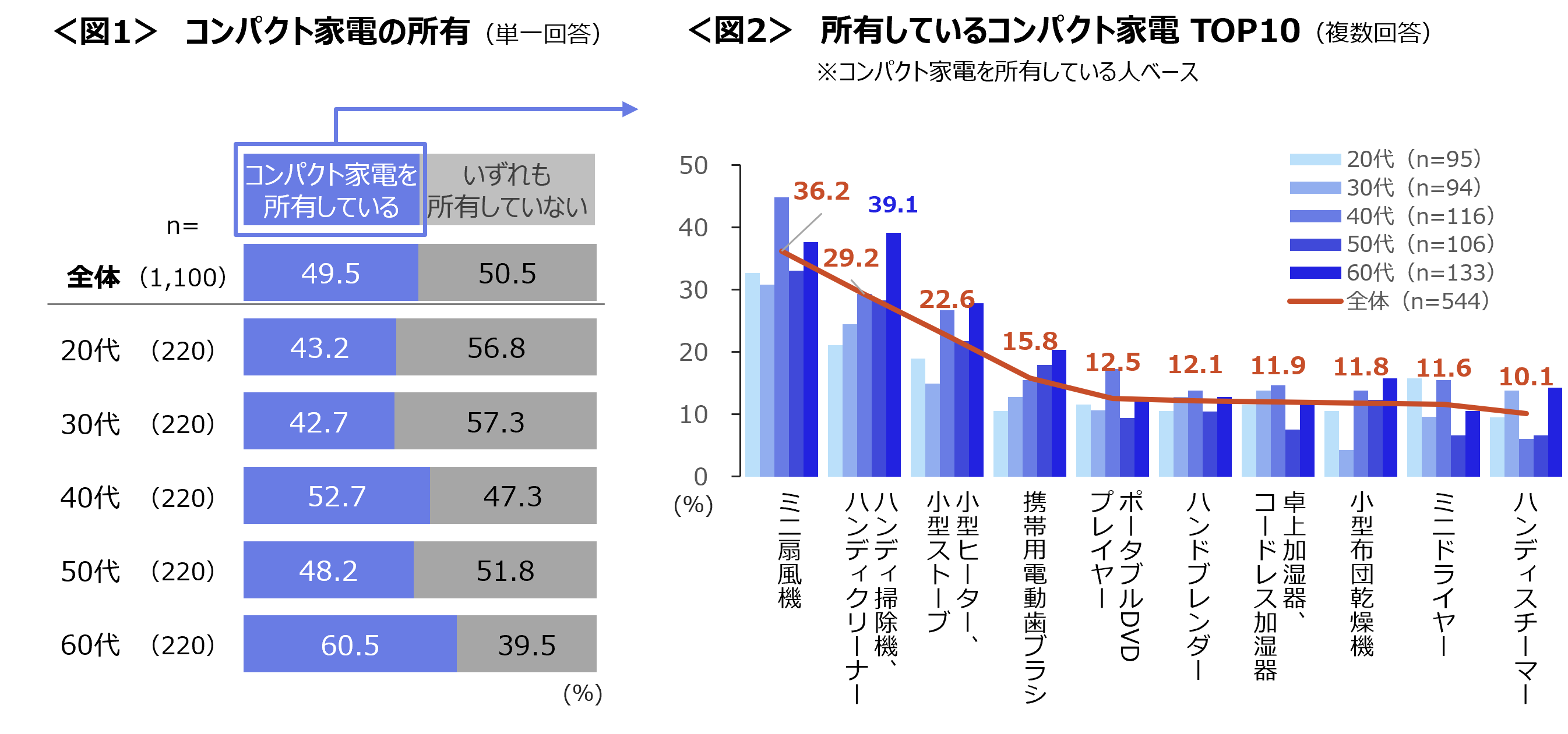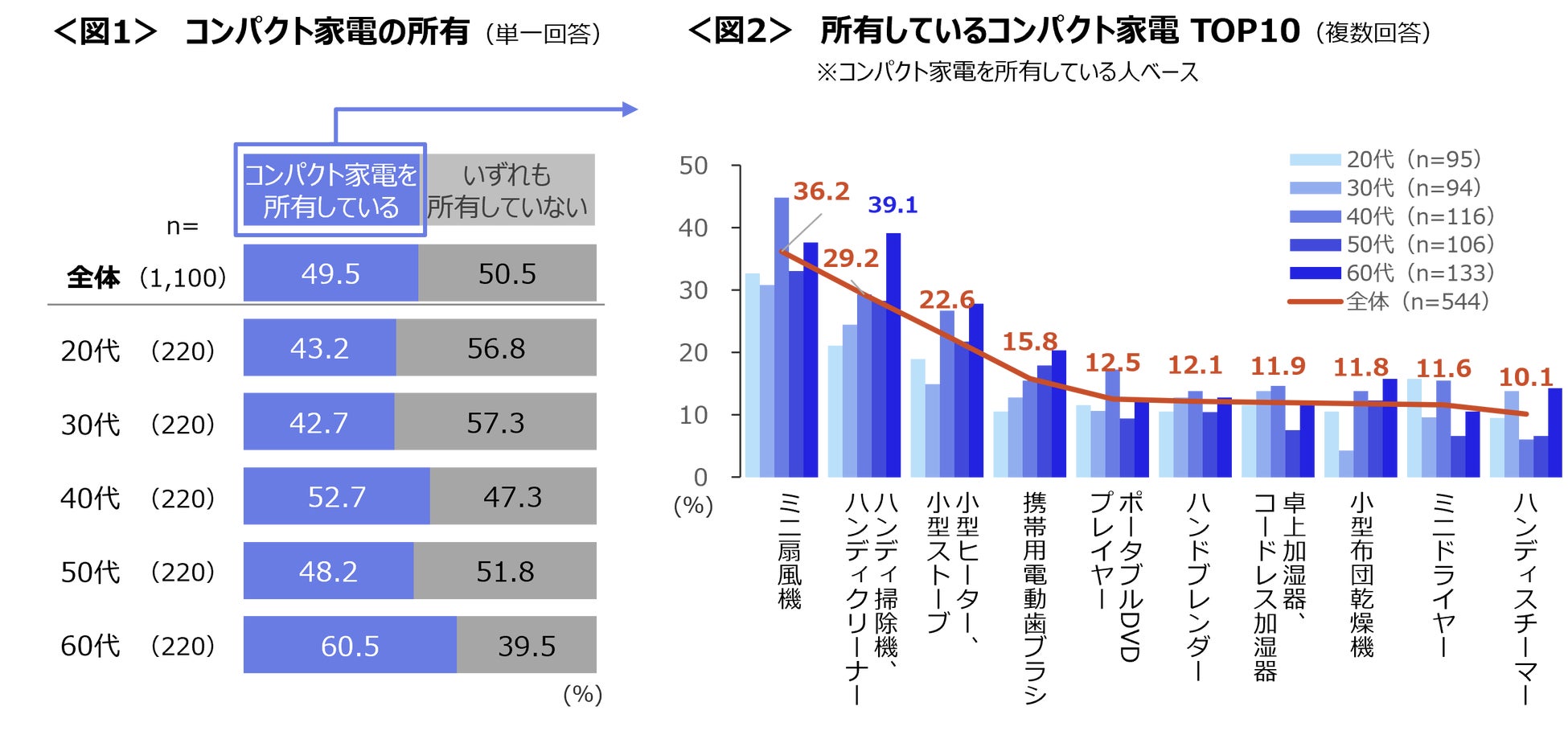 コンパクト家電を所有している人は半数。所有率が高いのは、「ミニ扇風機」「ハンディ掃除機」「小型ヒーター」。