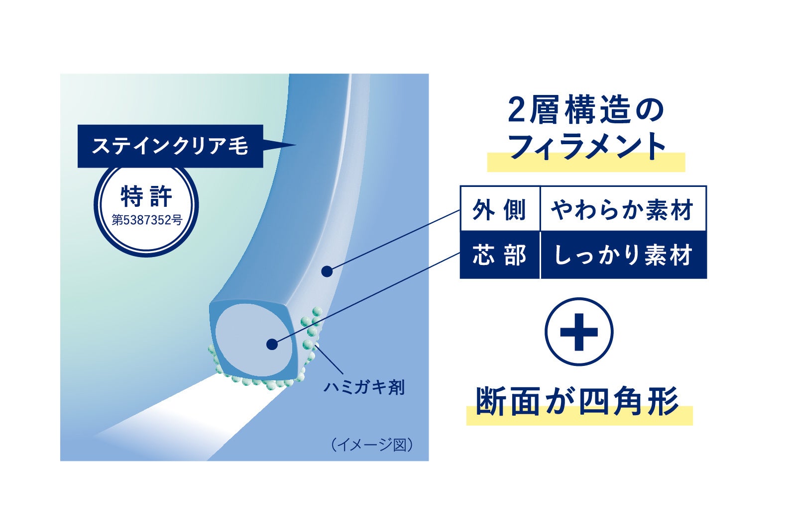 ①ステインクリア毛は外側の「やわらか素材」、芯部の「しっかり素材」の2層でできた、ラバーで覆われた断面が四角形の毛(図1)。歯面との接触面積が広く、ハミガキをしっかり保持して運ぶから、効果的にステインを除去します。