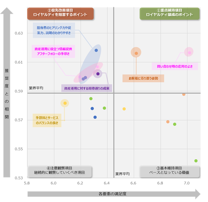 一方で、ロイヤルティを向上させるために優先的に改善すべき項目としては、「資産運用に対する期待通りの成果」に加え、「資産運用に役立つ情報提供(世界経済・為替の動き・税制・制度変更等)」、「アフターフォローの手厚さ(継続的な訪問や電話・再提案等)」となりました。さらに、「資産状況や投資方針、ニーズに対するヒアリング力」や「自分に合った商品・サービスの提案力」、「商品の特性、手数料、リスク等の説明のわかりやすさ」といった担当者に関する項目についても、今後の改善が期待される結果となりました。また、「手数料とサービスのバランスの良さ(コストパフォーマンス)」は昨年度は優先改善項目だったものの、今年度においてはロイヤルティへのインパクトが低下し、注意観察項目に移行しました。