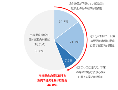 昨今、地政学的リスクの高まりや世界経済の不確実性などを背景に市場動向が変動しやすくなっているなか、2025年4月頃の市場動向急変時において、対象の証券会社から案内や通知を受けたかどうかを調査しました。その結果、市場動向急変に関する案内や通知を受けた割合は46.0%となりました。また、案内や通知を受けた内容についてみると、①「株価が下落している旨の注意喚起のみの案内や通知」が14.7%となり、②「①に加えて、下落の要因や市場の動向に関する案内や通知」は21.7%となり、③「①、②に加えて、下落の際の対処方法や心構えに関する案内や通知」は7.5%にとどまりました。NPS上位のSMBC日興証券や三菱UFJモルガン・スタンレー証券においては、市場動向急変に関する案内や通知を受けた割合が高くなりました。