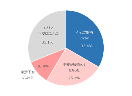 さらに、市場動向急変に関する案内や通知を受けて、不安の解消につながったかどうかを調査したところ、「不安が解消された」と回答した割合は33.4%となりました。「不安が解消されなかった」(25.1%)や「余計不安になった」(10.4%)も一定割合みられました。さらにNPSについても分析したところ、株価急落に関する案内や通知を受けて「不安が解消された」人のNPSは13.9と、他の回答者と比較して高くなりました。