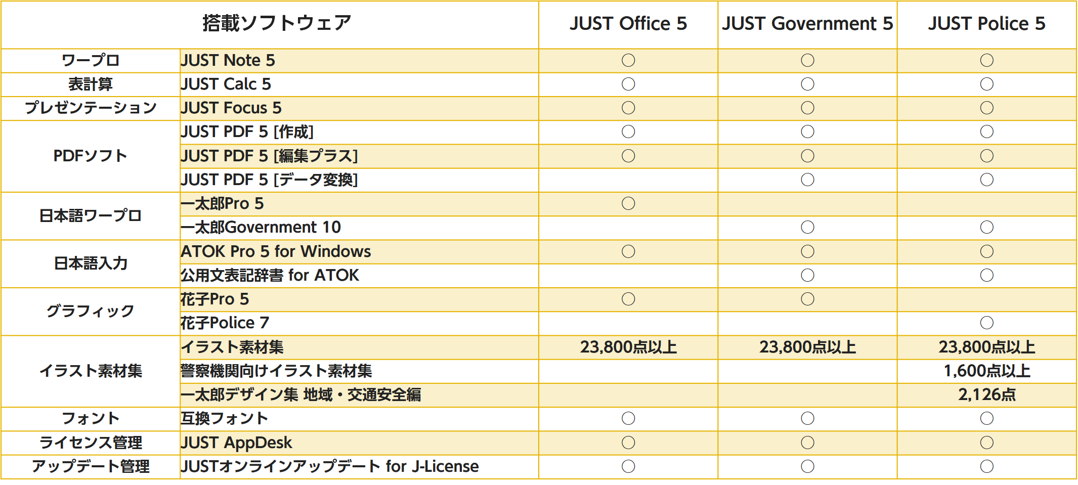 *「公用文作成の考え方」に対応した文書校正は「一太郎 Pro 5 / 一太郎Government 10/JUST Note 5/花子Pro 5/花子Police 7」、日本語入力は「JUST Government 5/JUST Police 5」で可能です。