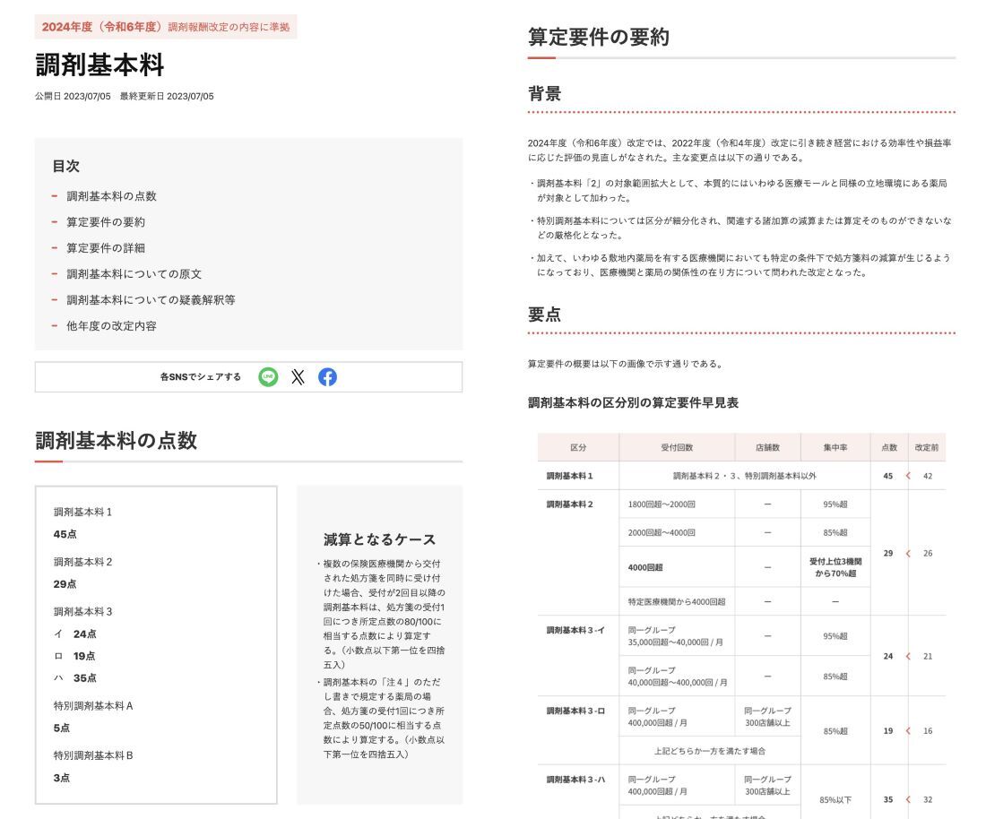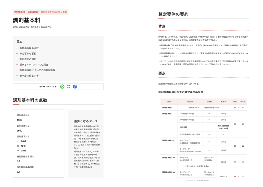 ①薬剤師監修のもと記事を作成。厚生労働省の調剤報酬に関連した文書(原文)を点数項目毎に整理し、その要約や詳細、原文、疑義解釈という構成を採用することで、多様なニーズ(点数だけを知りたい、詳しく理解したいなど)に対応