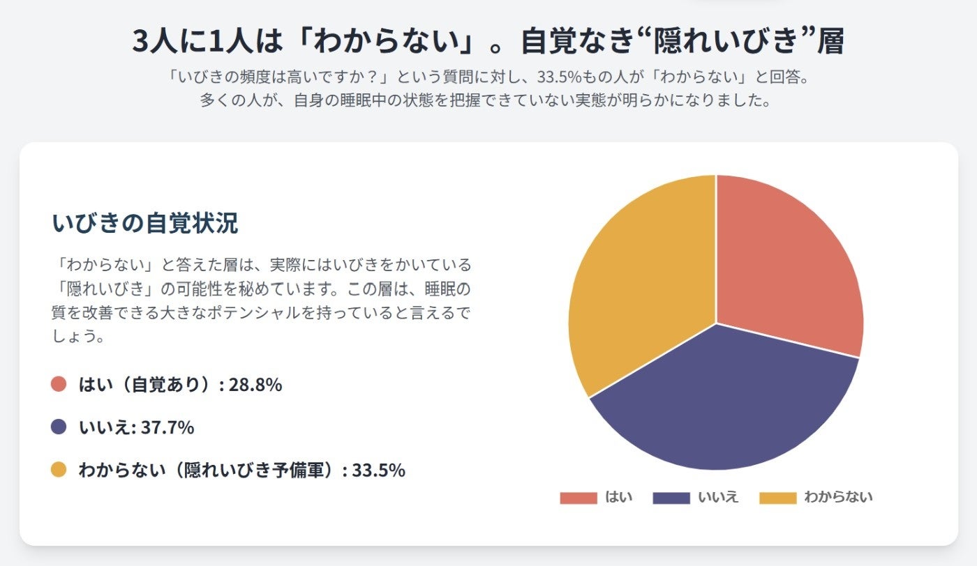 問題はさらに根深く、今回のデータ分析で「枕への不満」と「いびきの頻度」に明確な相関が見られました。 しかし、約3人に1人(33.5%)は自身のいびきを自覚していません。