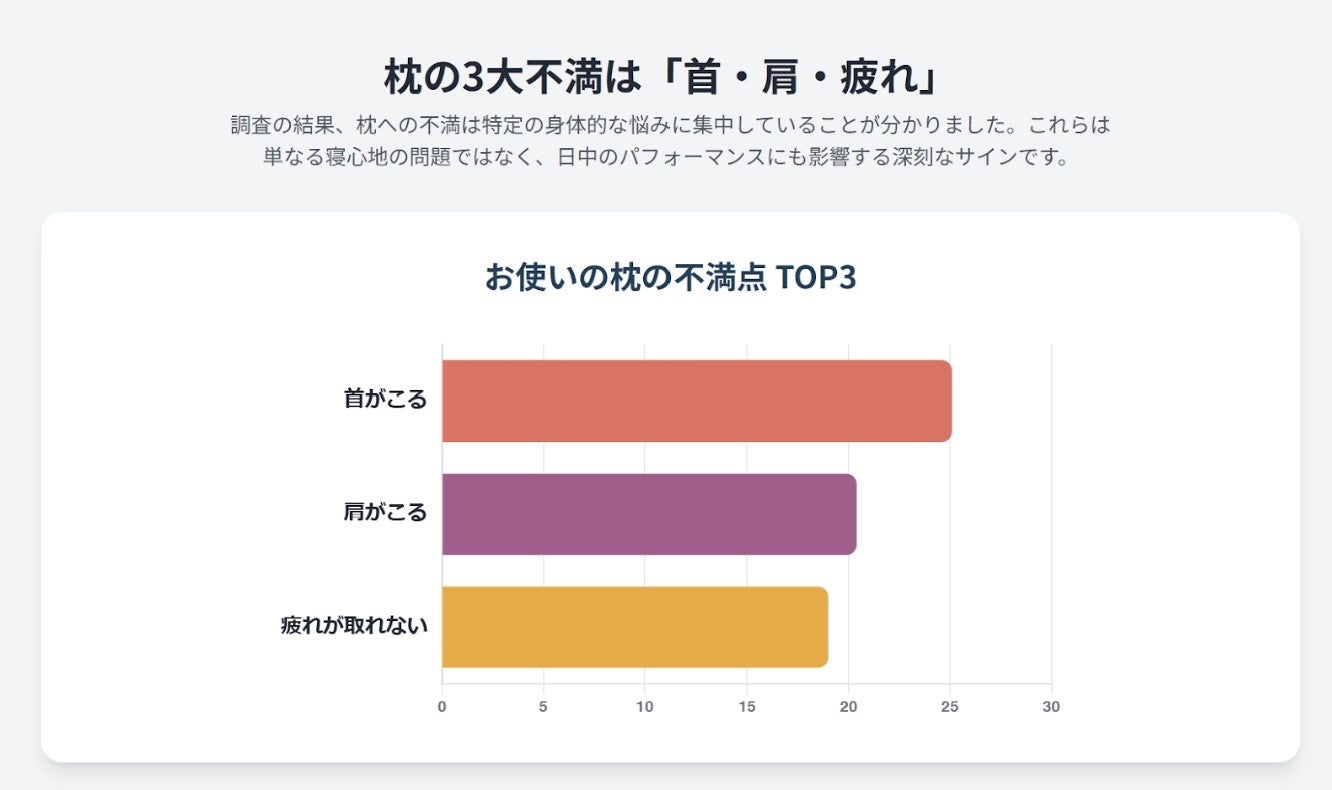 不満の上位には「首こり」「肩こり」「疲れが取れない」といった切実な悩みが並び、多くの人が睡眠による休養を十分に得られていない実態が浮き彫りとなっています。