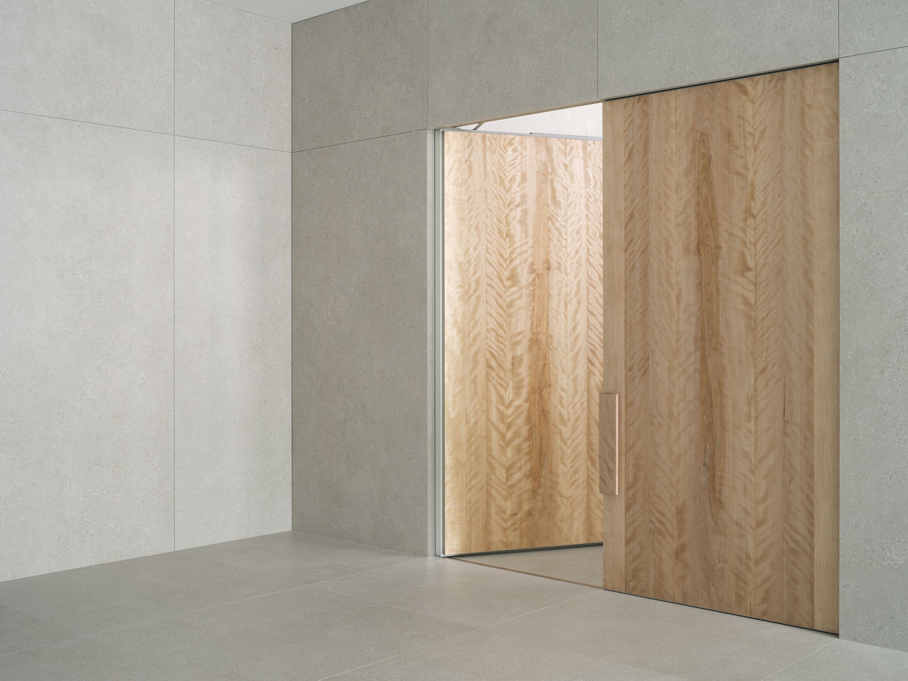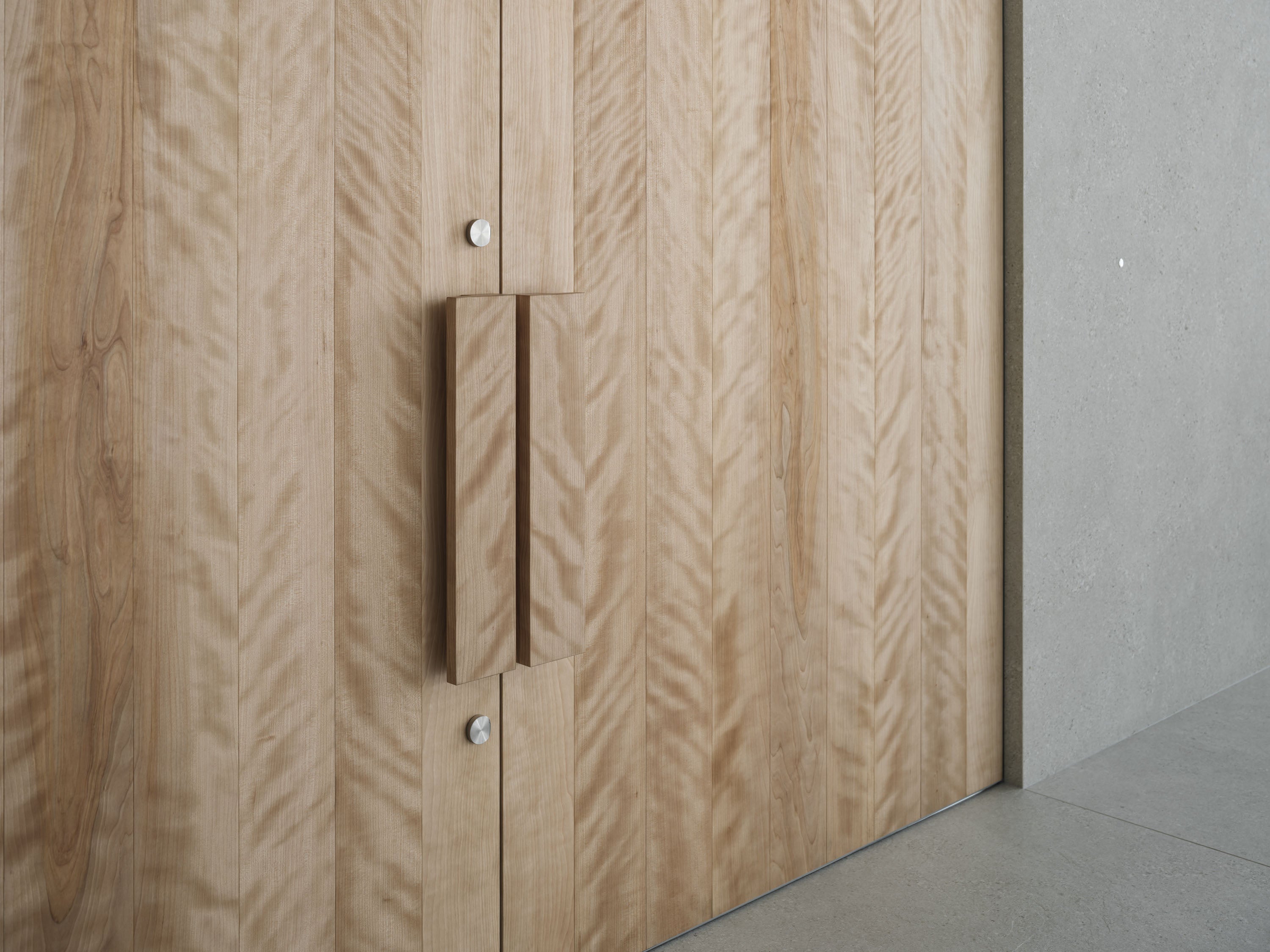 戸が重なる戸先・召合せ部は、内外共にフラットに納めることで、面材の美しさを際立たせています。また、ピボットヒンジやコンシールドクローザーの採用により、無駄な要素のない美しいデザインとスムーズな動きを実現。ハンドルのサイズ・取付位置・仕上げなどはご要望に合わせて対応可能です。
