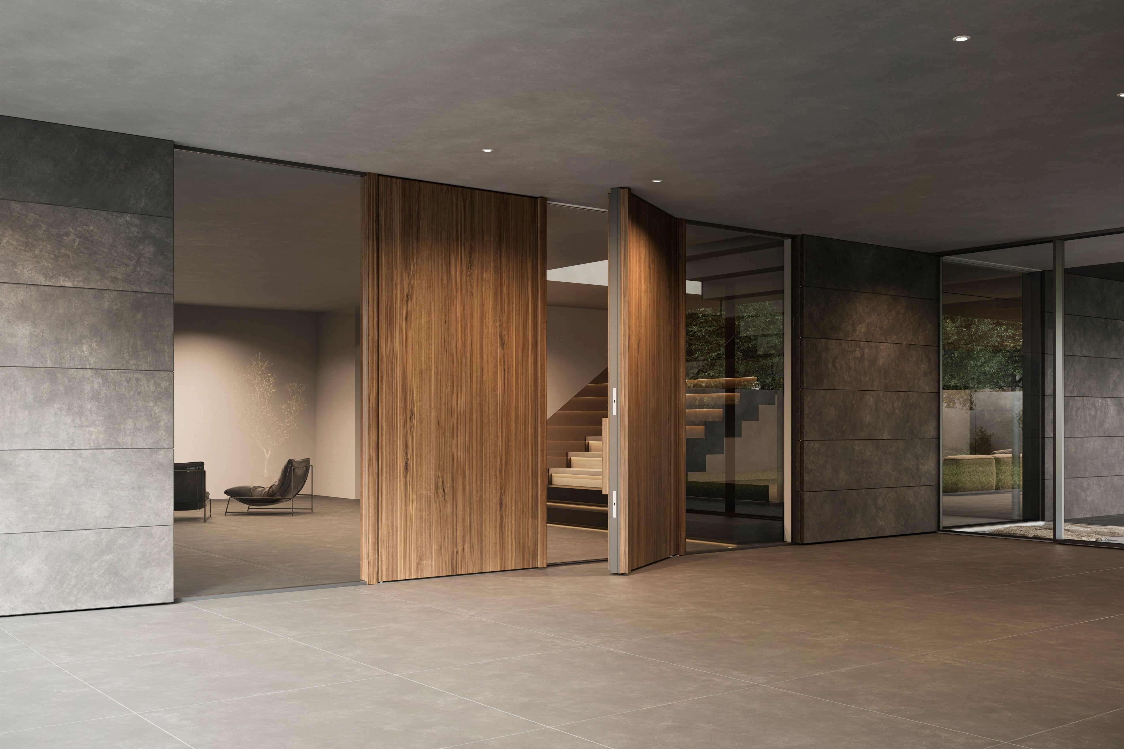 天然木だけではなく、マット・サテン・ポリッシュ・サビ調・ムラ出しなど、味わい深い表情を醸し出す金属面材にも対応します。片開き・両開き、袖部にはドア面材と同一の壁パネル、またはガラスを施すことが可能。高さは最大3m、幅は片面で最大1.5m、両開きでは最大3mの開口を実現します。