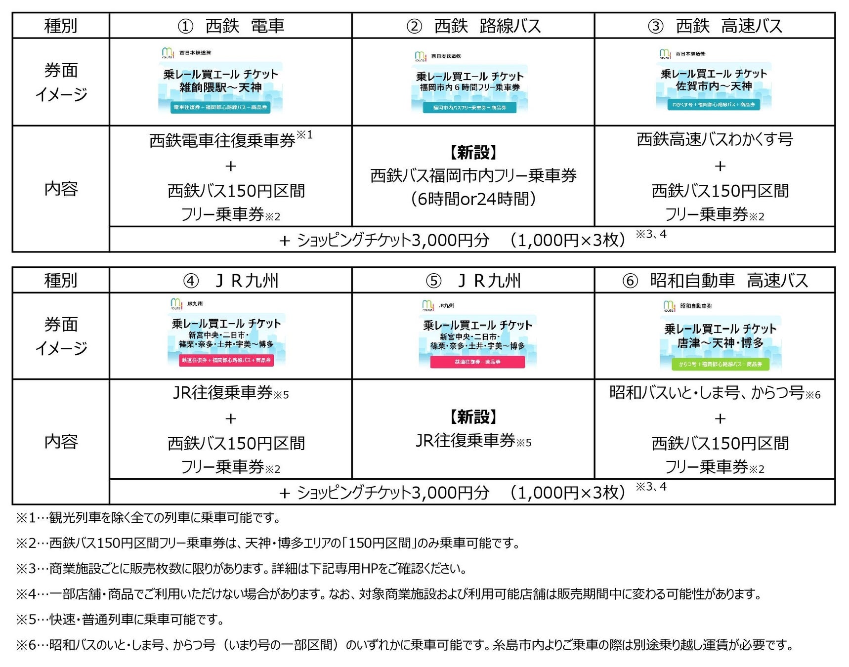 第三弾となる今回は、前回までの内容から更にパワーアップさせ、JR九州の利用可能エリアを拡大するとともに、新たに西鉄バス福岡市内フリー乗車券を選択できるようにいたしました。また、3,000円のショッピングチケットを1,000円×3枚へ設定変更し、異なる施設でも利用可能にすることで、より利便性が高く、魅力ある商品へとなっています。