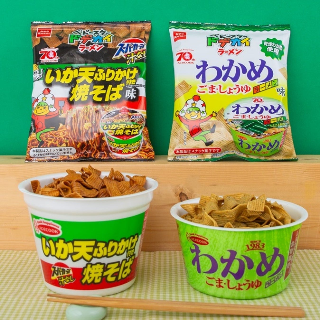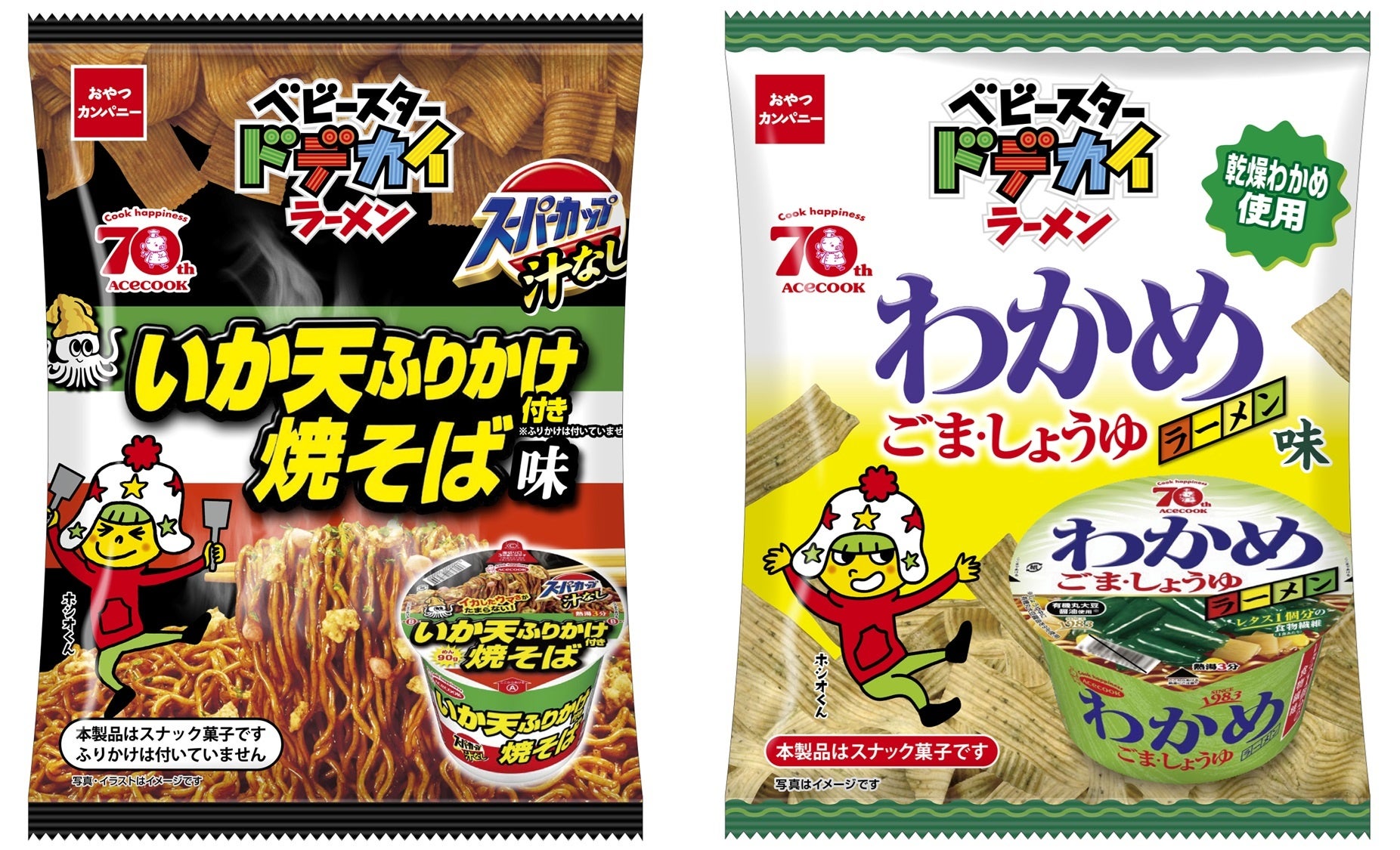 株式会社おやつカンパニー(本社所在地:三重県津市 代表取締役社長:横山正志)は、エースコック株式会社(本社所在地:大阪府吹田市 代表取締役社長:村岡寛人)とのコラボ企画商品として、『ベビースタードデカイラーメン(エースコック スーパーカップ汁なし いか天ふりかけ焼そば味/わかめラーメン味)』2品を、2024年8月19日(月)より全国にて発売します。