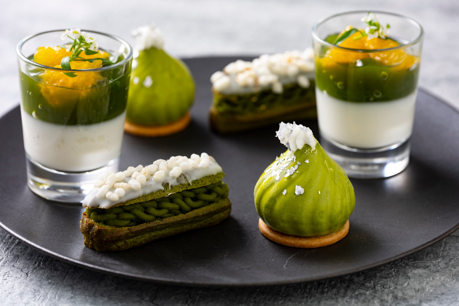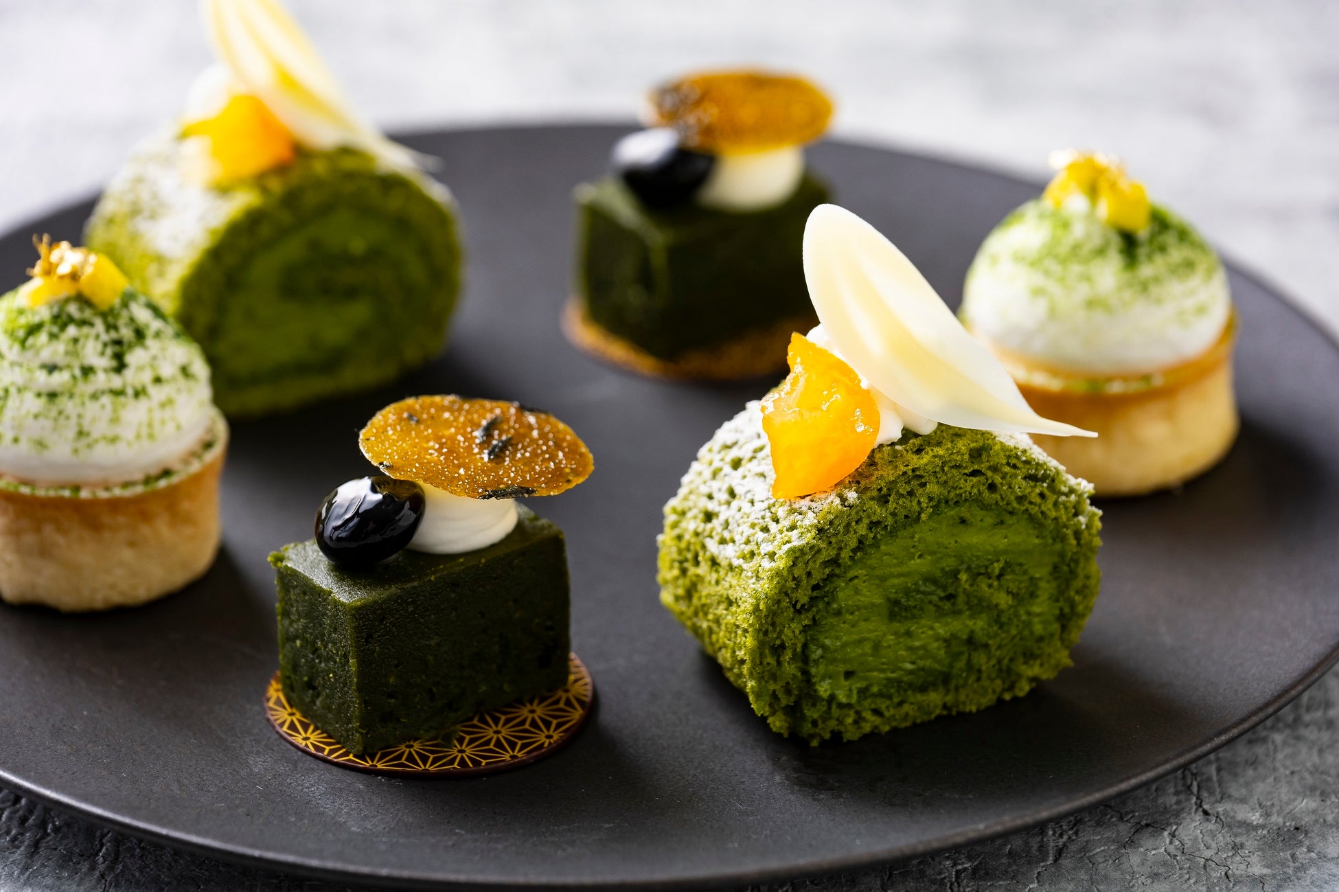 「深蒸し煎茶 緑風」を使用した煎茶ゼリーとマンダリンオレンジソースにソーダを合わせた爽やかなアミューズから始まり、抹茶クリームをしっとり甘い抹茶のスポンジ生地で包み金柑をのせたロールケーキや、柑橘のジュレを閉じ込めた艶やかな抹茶ムース、黒豆とほうじ茶のチュイルをのせた抹茶テリーヌなど、深みのある抹茶の味わいと優しい甘みに心和むスイーツをご用意。