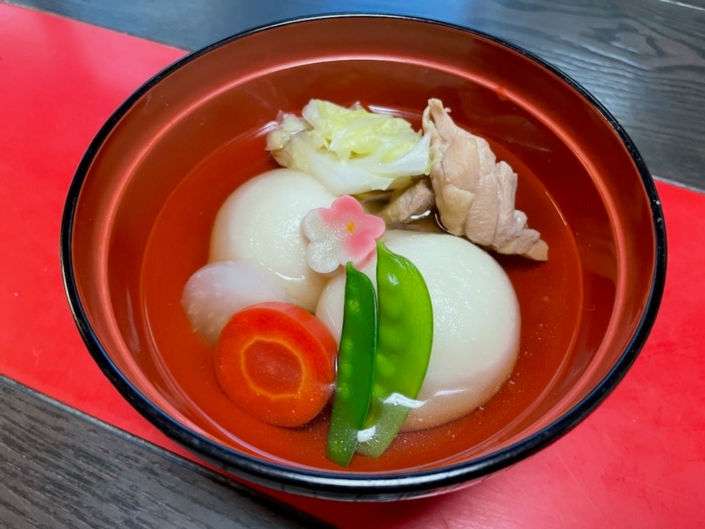 白味噌仕立てにあん入りの丸餅、家族円満の願いを込めた輪切りの大根、金時人参などが入った「あんもち雑煮」。