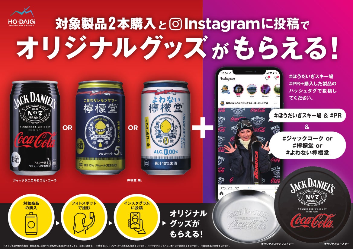 ほうだいぎスキー場内のセンターハウスに、ジャックコーク特設フォトスポットを設置します。ジャックコーク、檸檬堂、よわない檸檬堂から2本をご購入いただいた上で、以下の手順でInstagramの投稿をして、販売員に投稿を見せていただいた方に、もれなく、ジャックコーク・オリジナルのステンレストレーかコースターをプレゼントいたします。