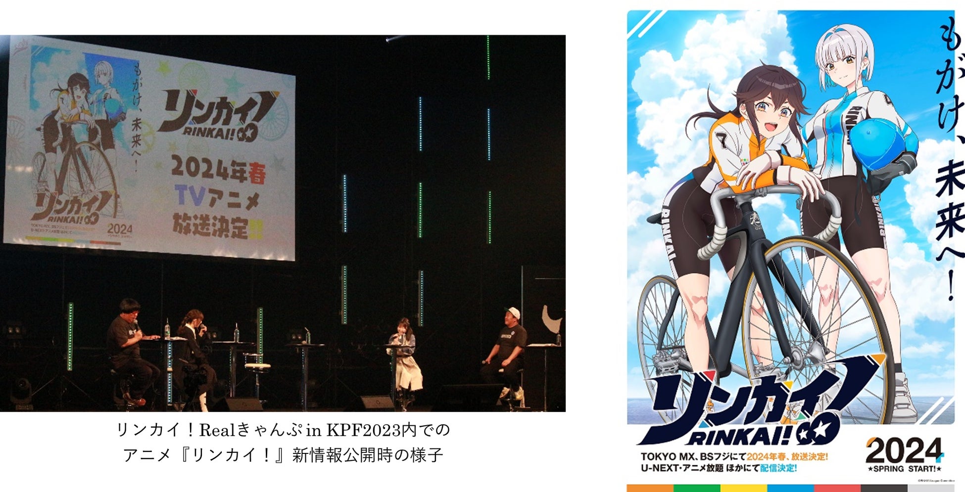 11月25日(土)に実施したイベント「リンカイ!Realきゃんぷ in KPF2023」では、プロジェクトの始動からこれまでの道のりを裏話も交えて振り返ったあとに、メインキャラクターのCVを担当する川村海乃さん(伊東泉役)と葵あずささん(平塚ナナ役)からアニメ化の最新情報として放送時期と放送局、配信の決定に加え、ストーリーとティザービジュアルを発表しました。現在のアフレコ状況を聞かれた川村海乃さんは、「アフレコは、毎週現場で新たな台本をいただくので、(ストーリーの全貌を知っているわけではなく)キャラクターと同じ気持ちでやれていると思います。」とアフレコ現場の様子を語りました。また、ゲストとして登場した現役の女子競輪選手・小林莉子さんは「養成所では1日に100km以上走るので、自転車に乗りながら途中記憶がなくなるような厳しい日々を送りました。」「1年間外部との接触ができなくなるので、同期メンバーとの絆が生まれます。」など、アニメの舞台となる競輪の養成所における経験や、「リンカイ!Projectのアニメをきっかけにリアルな競輪場にお越しいただき、ぜひ実際に走っているところを見ていただければと思います。」とアニメ放送に対する期待を語りました。