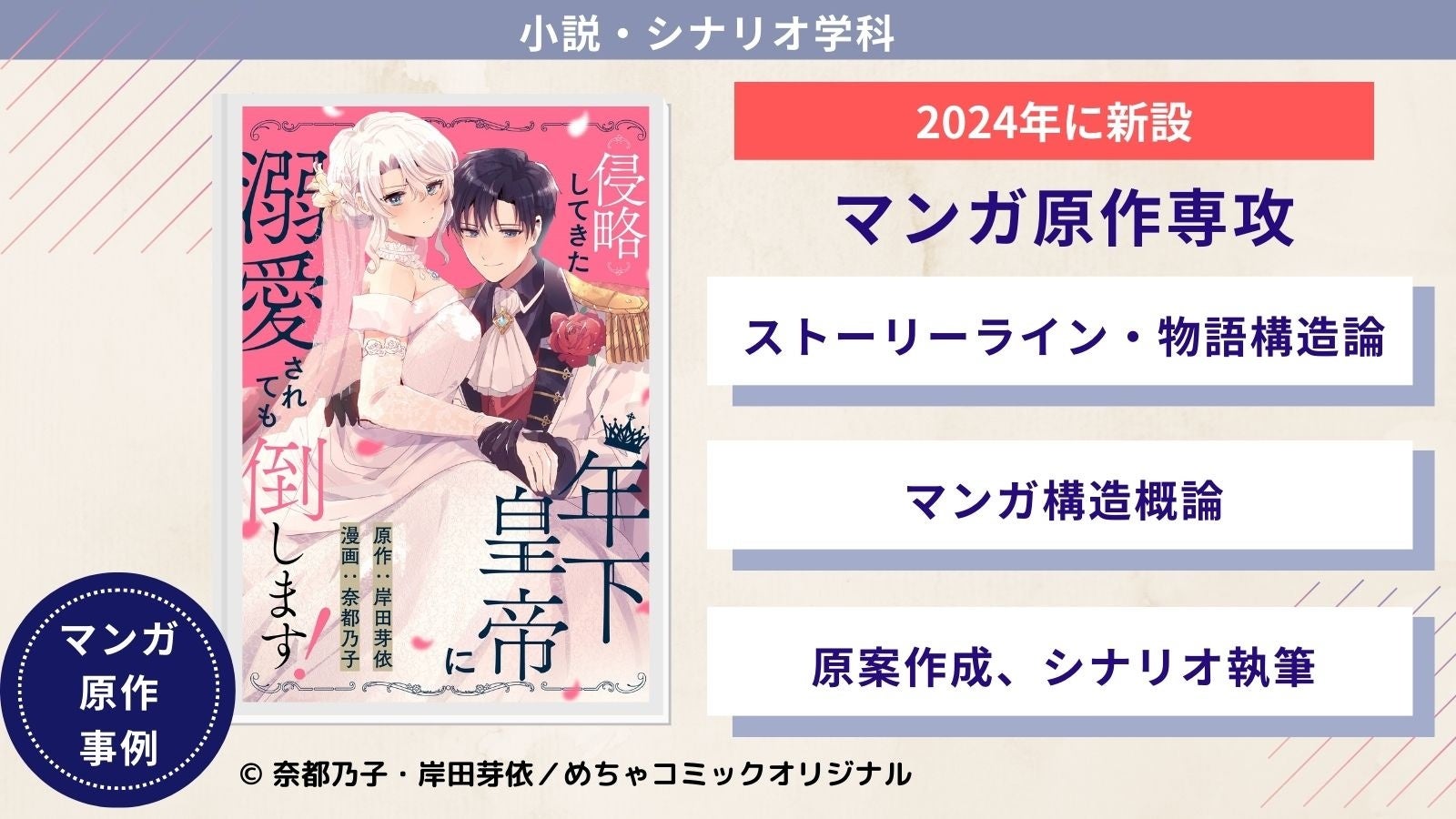 2024年度より小説・シナリオ学科(定員:35名)では、『ライトノベル専攻』『文芸小説専攻』『アニメ・ゲームシナリオ専攻』の3つの専攻別講義に加えて、『マンガ原作専攻』を新設します。