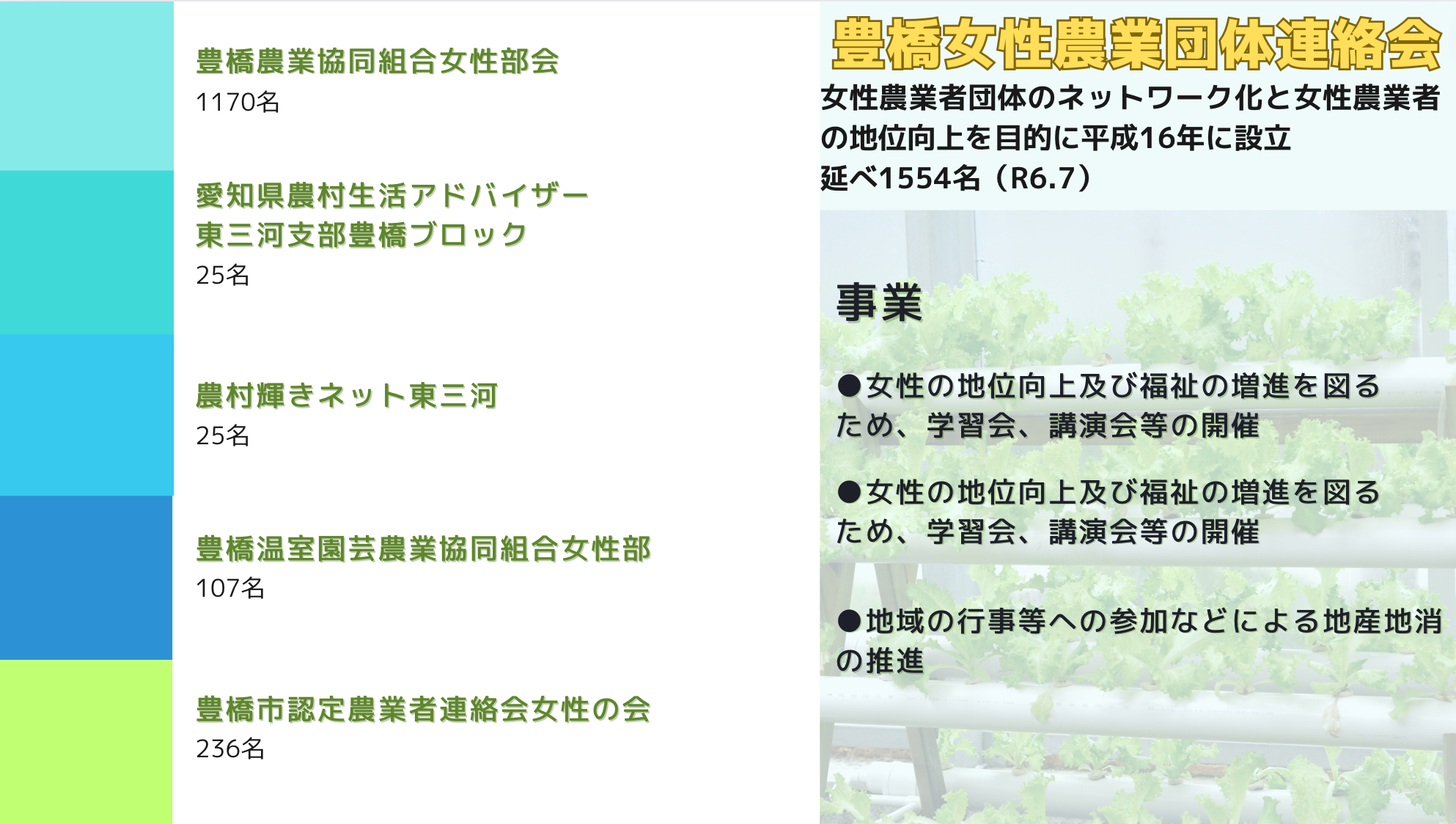 女性農業団体のネットワーク化と女性農業者の地位向上を目的として、市内農業関連分野における女性団体5団体で設立された組織です。