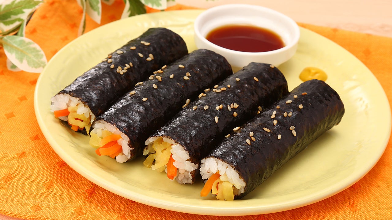 たくあん、人参、ナムルの海苔巻きをごま油の風味をきかせて仕上げました。一度食べたら手が止まらない、やみつきになる味付けです。お好みで別添のからし酢醤油をつけるのもおすすめです。