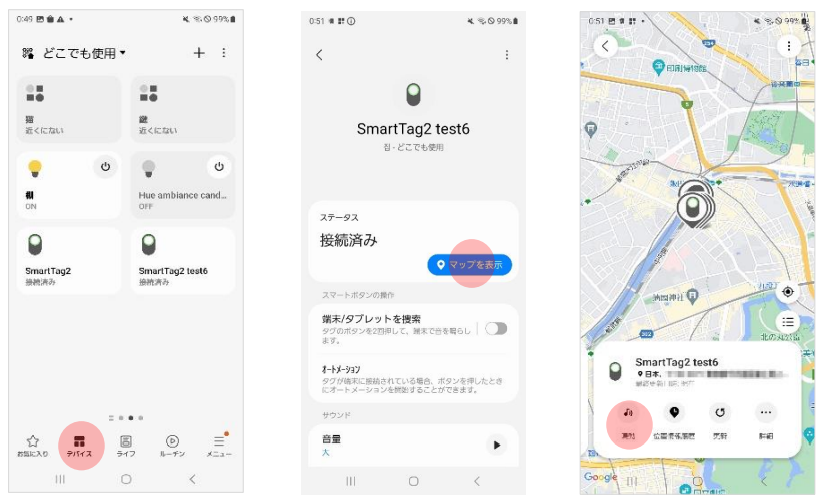 ②「Galaxy SmartTag2」を選択 >「マップを表示」を選択 >「詳細」を選択