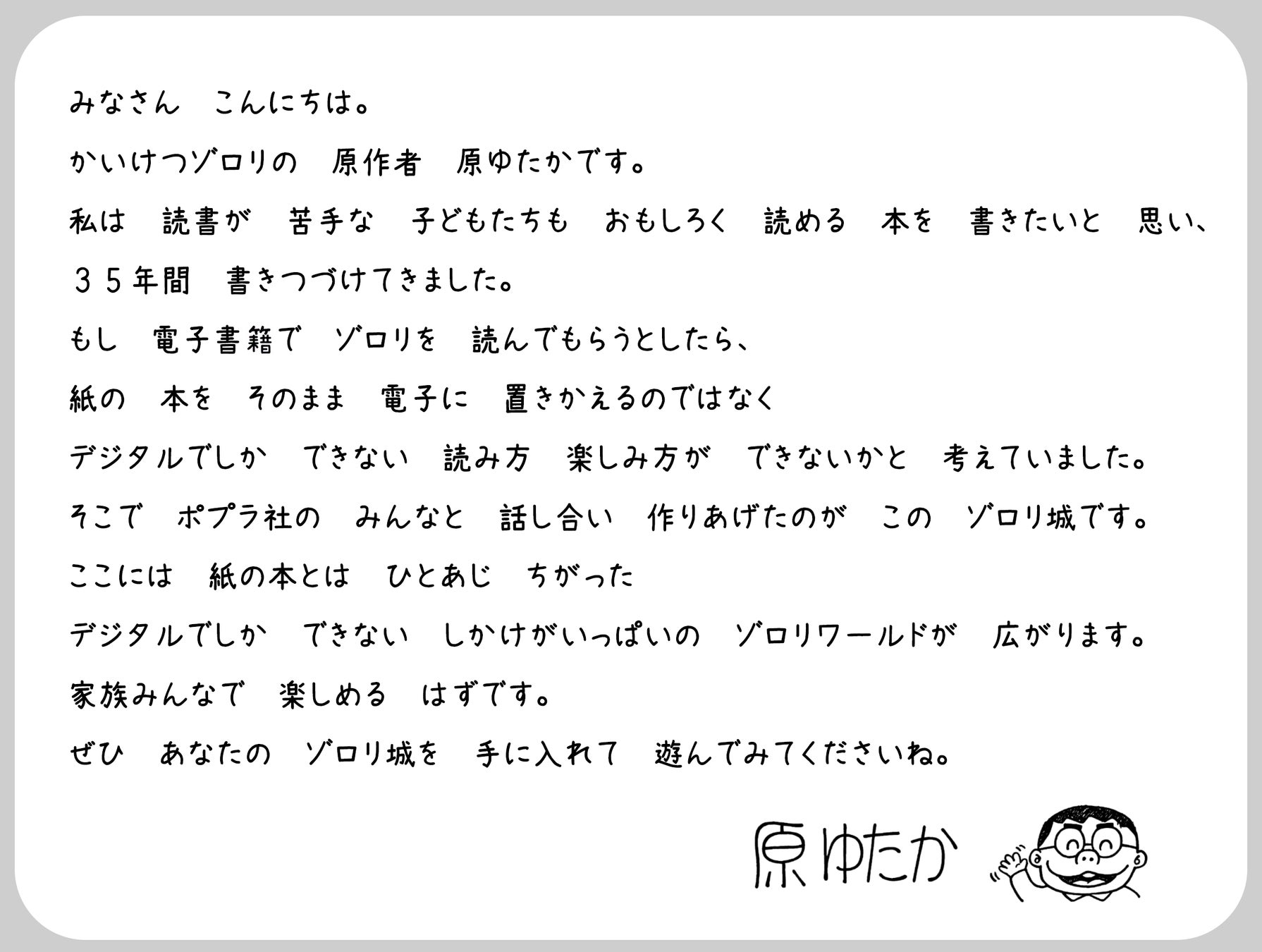 従来より『かいけつゾロリ』シリーズは、めいろやマンガ・図解など、読者を飽きさせない工夫や演出が散りばめられた独自の読書体験を提供してきました。原作者である原ゆたかは、絵や文章、ページをめくるという行為が立体的な演出となって物語の面白さをさらに引き立て、長い文章を読むのが苦手な子の手助けになりたいという想いがゾロリ誕生のきっかけだと語っています。ゾロリならではの「ページをめくる楽しさ」に、デジタルならではのギミックを加える事で生み出される、まるで自分もゾロリと一緒に冒険をしているかのような物語の世界への没入感と、自分で物語を完成させる達成感は、「バーチャルゾロリ城」ならではのもの。